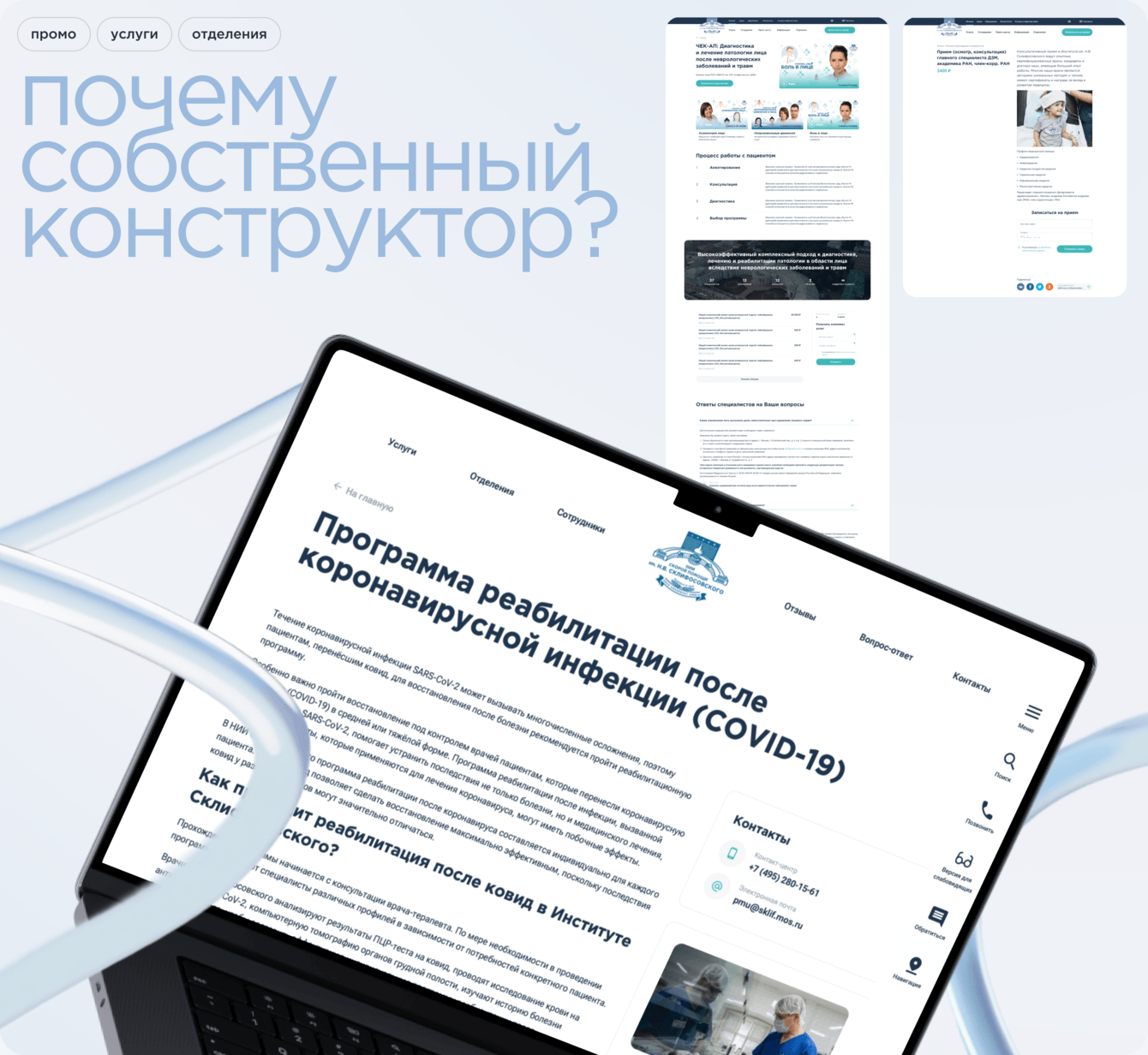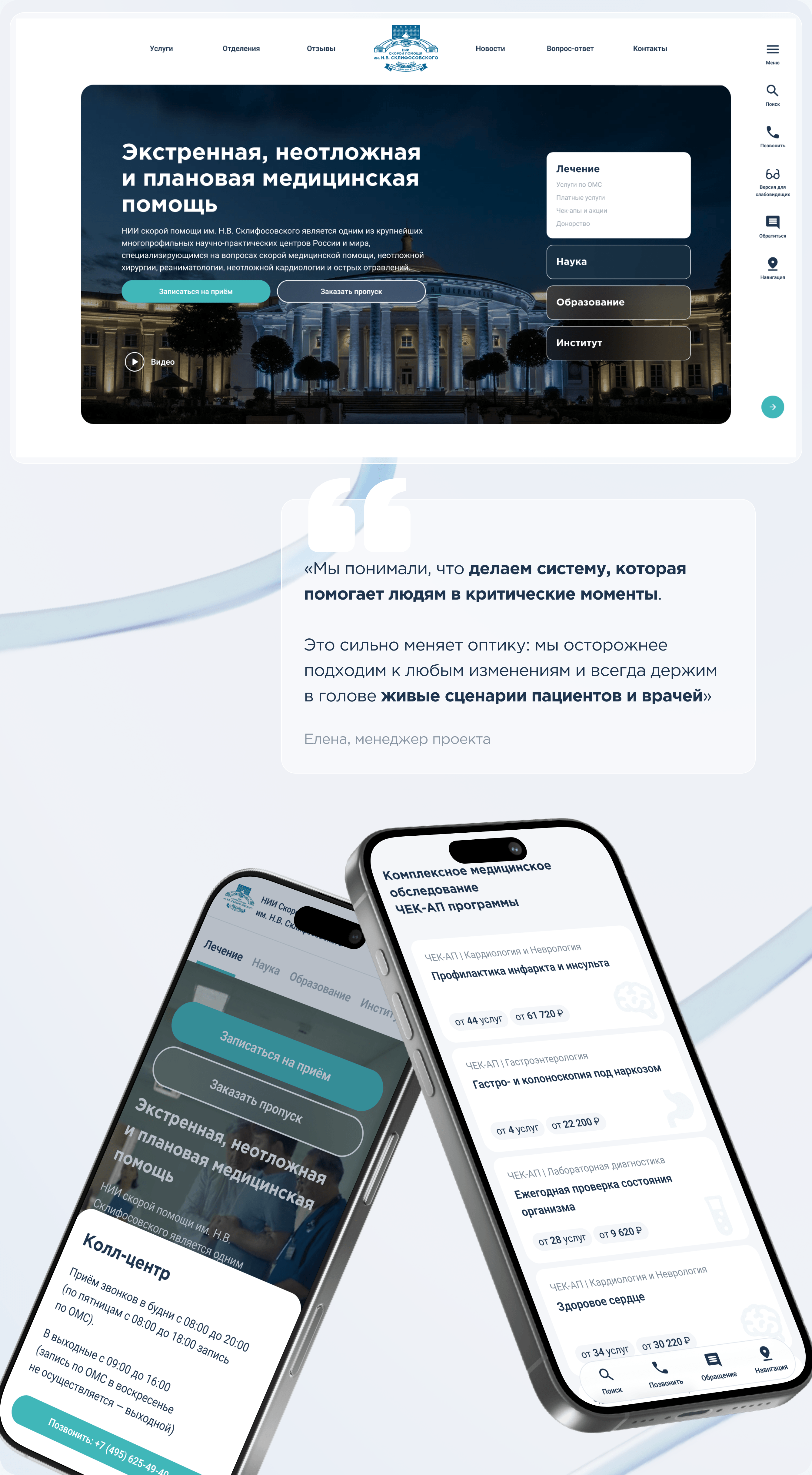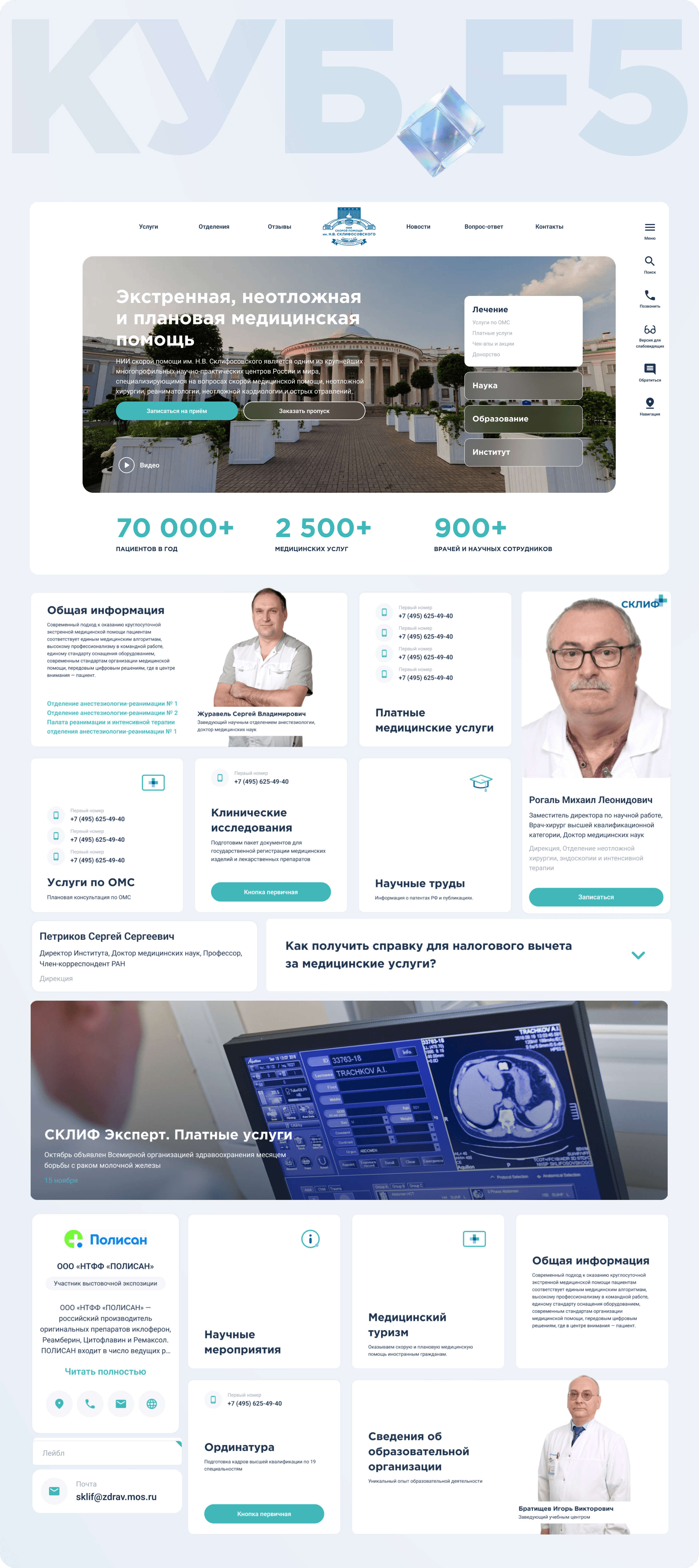 На первом этапе Склиф получил современный сайт, который реально работает на задачи Института. А далее несколько лет мы в тесном партнерстве с Институтом развивали сайт как продукт: