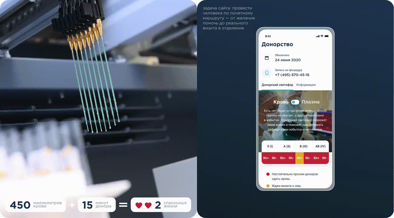 Отдельно проработали сценарии для родственников пациентов приёмного отделения и доноров: сделали понятные памятки и вывели на сайт «донорский светофор».