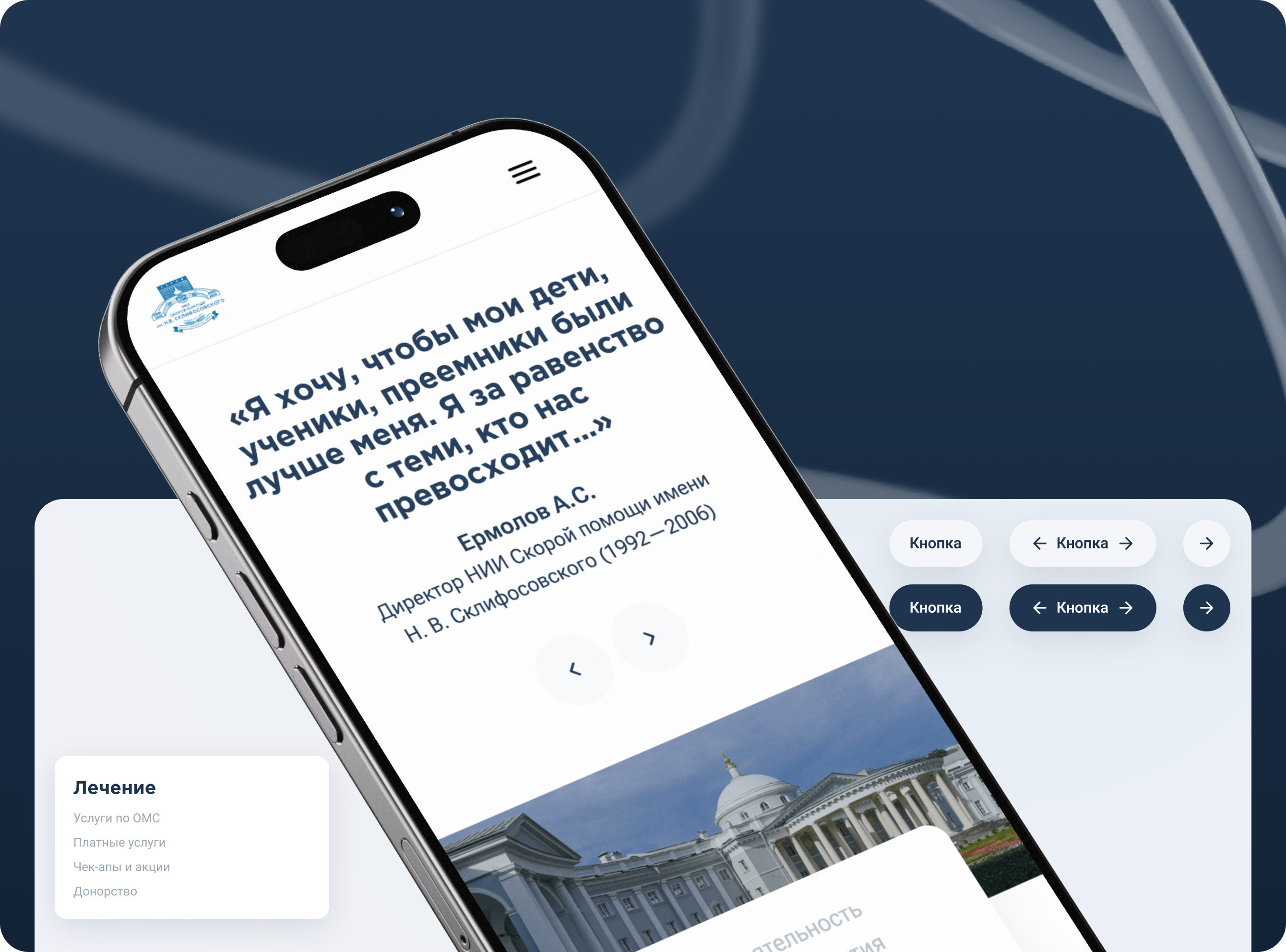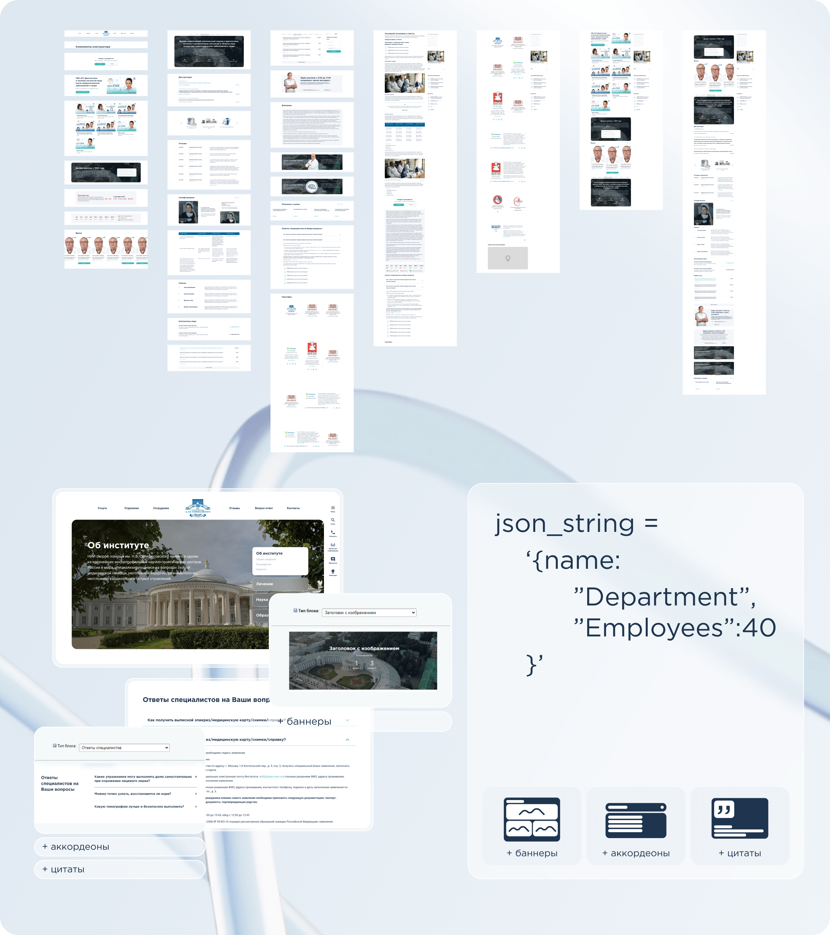 Мы собрали библиотеку элементов, которая покрывает все типовые задачи Склифа и даёт запас под будущее: профили врачей, расписания, образовательные программы, научные события, формы, отзывы, FAQ и т. д. Управляемость контента довели до максимума — фактически весь текстовый слой интерфейса в руках команды НИИ.