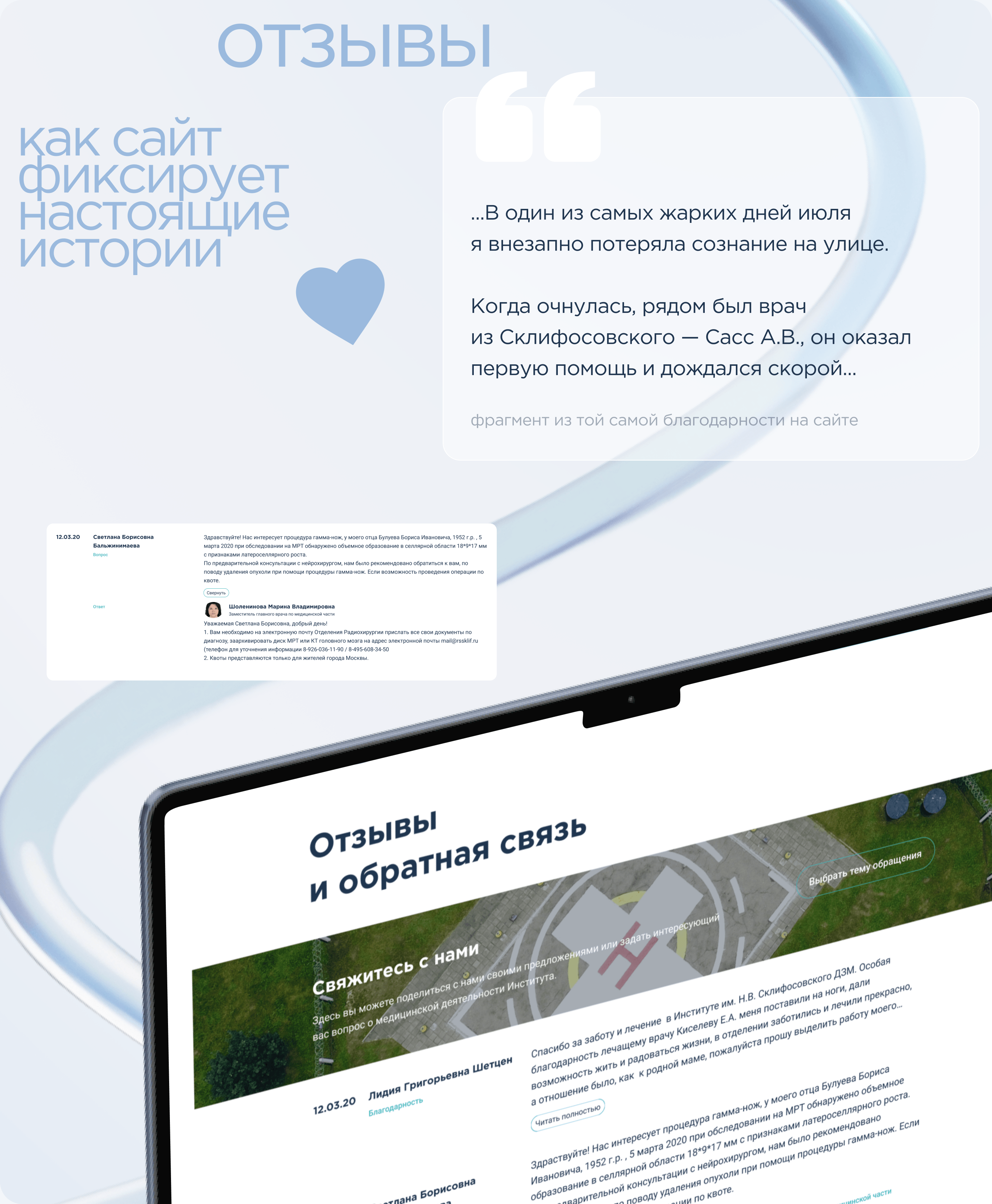 Склиф получает тысячи благодарностей от пациентов каждый год — и часть этих историй команда узнаёт именно через сайт: например, о случае, когда инструктор ЛФК на улице помог женщине, потерявшей сознание, узнали только из её онлайн‑отзыва.