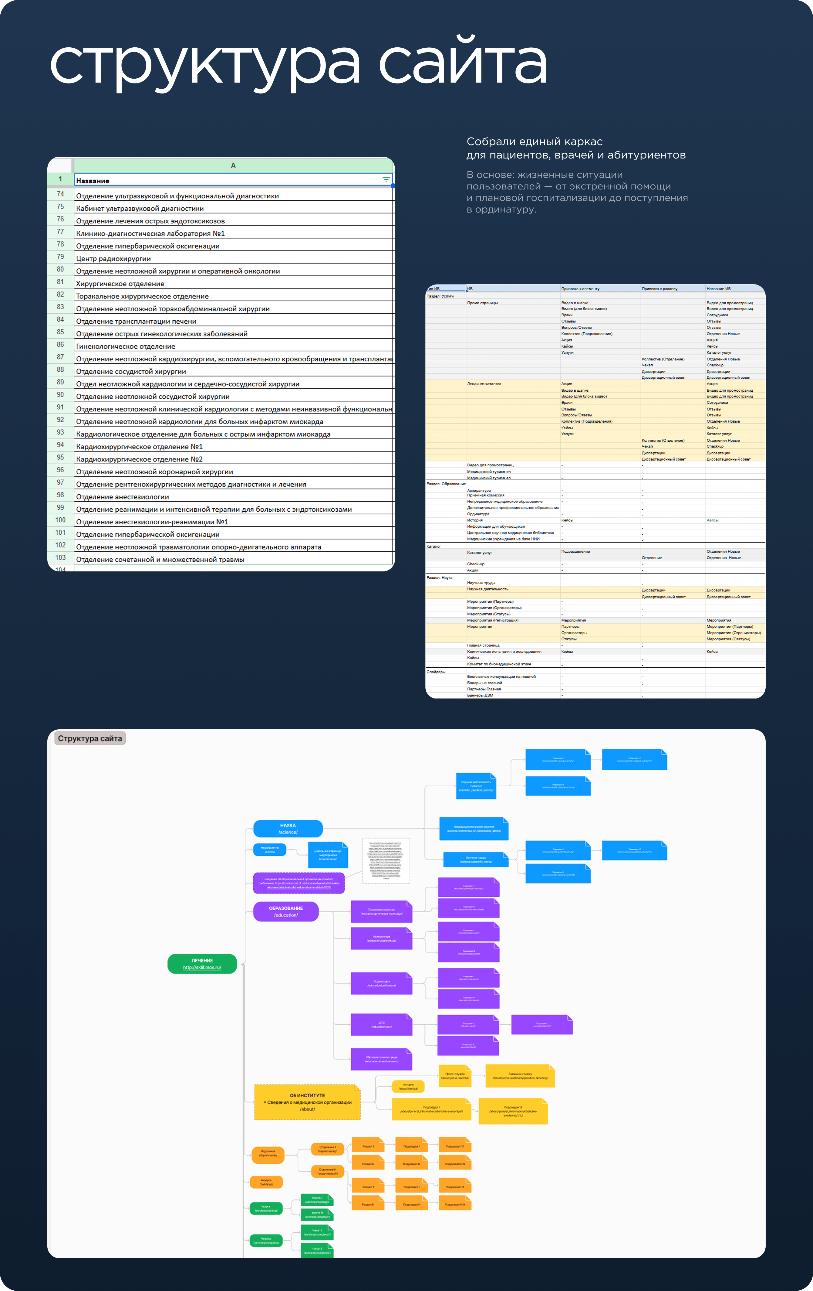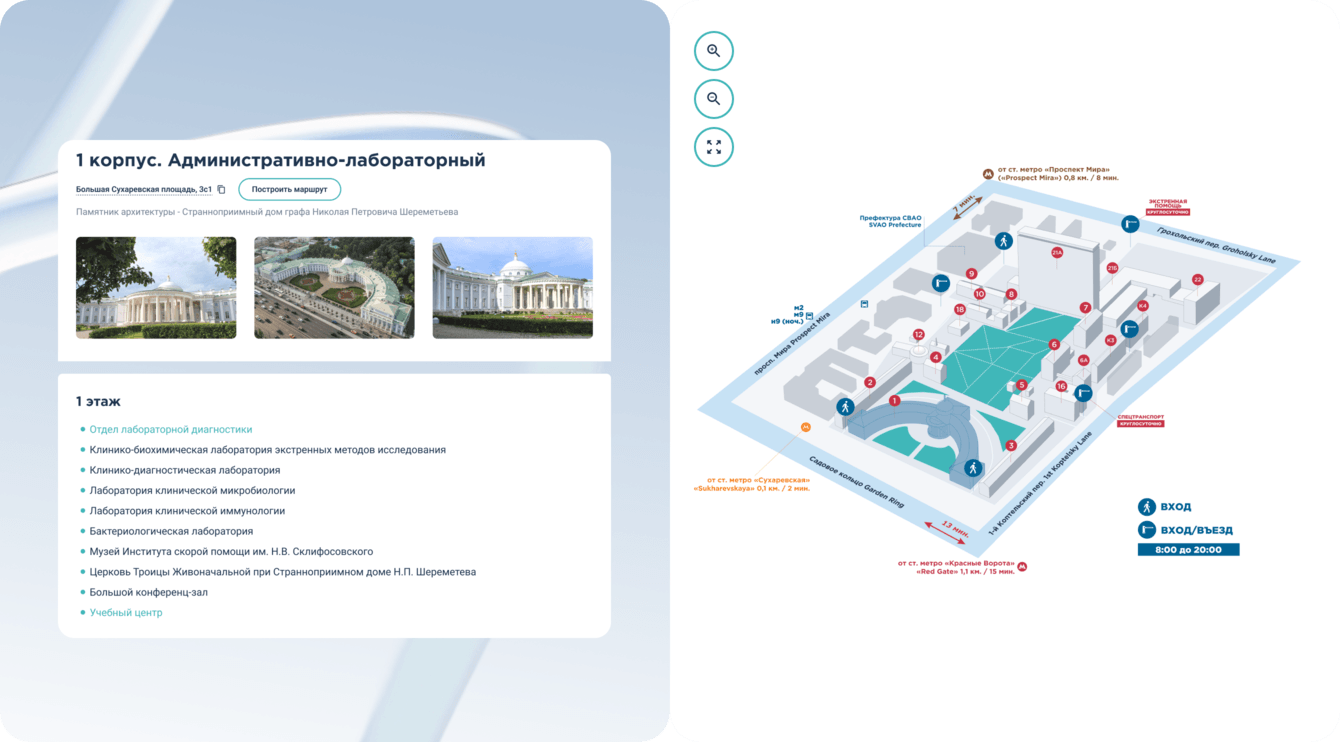 Структуру спроектировали вокруг реальных сценариев: что делает человек, когда ему нужен Склиф — как он ищет отделение, услугу, врача, как абитуриент проходит путь до подачи заявления.