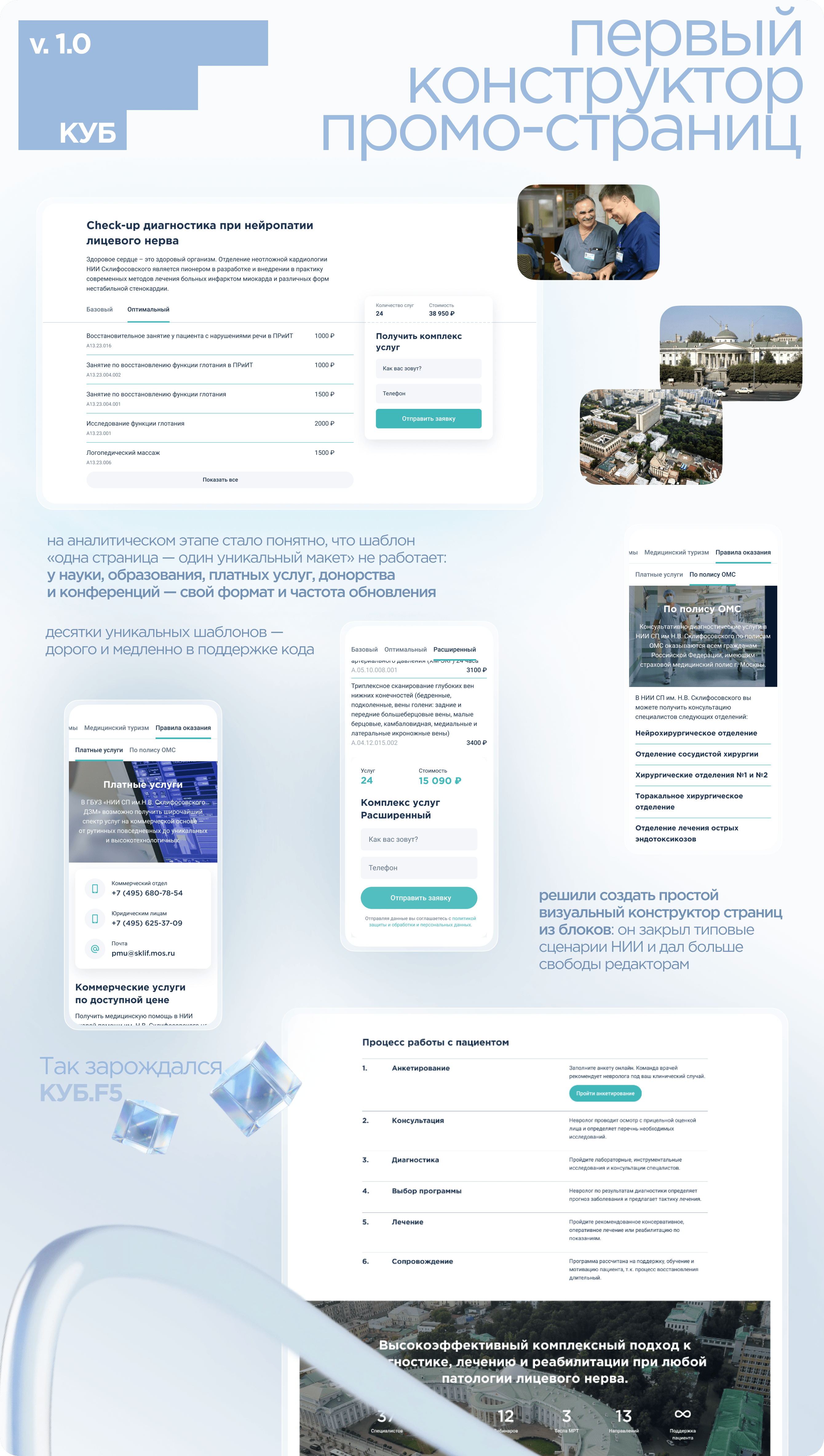 До конструктора запуск промо‑лендинга под новый чекап занимал недели: постановка задач, дизайн, верстка, тестирование. После внедрения конструктора маркетинговая команда Склифа стала запускать типовой лендинг за один день — без входа разработчиков в код. Так в первые полгода внутри НИИ на нашем конструкторе собрали 56+ продающих лендингов для чекапов и платных услуг.