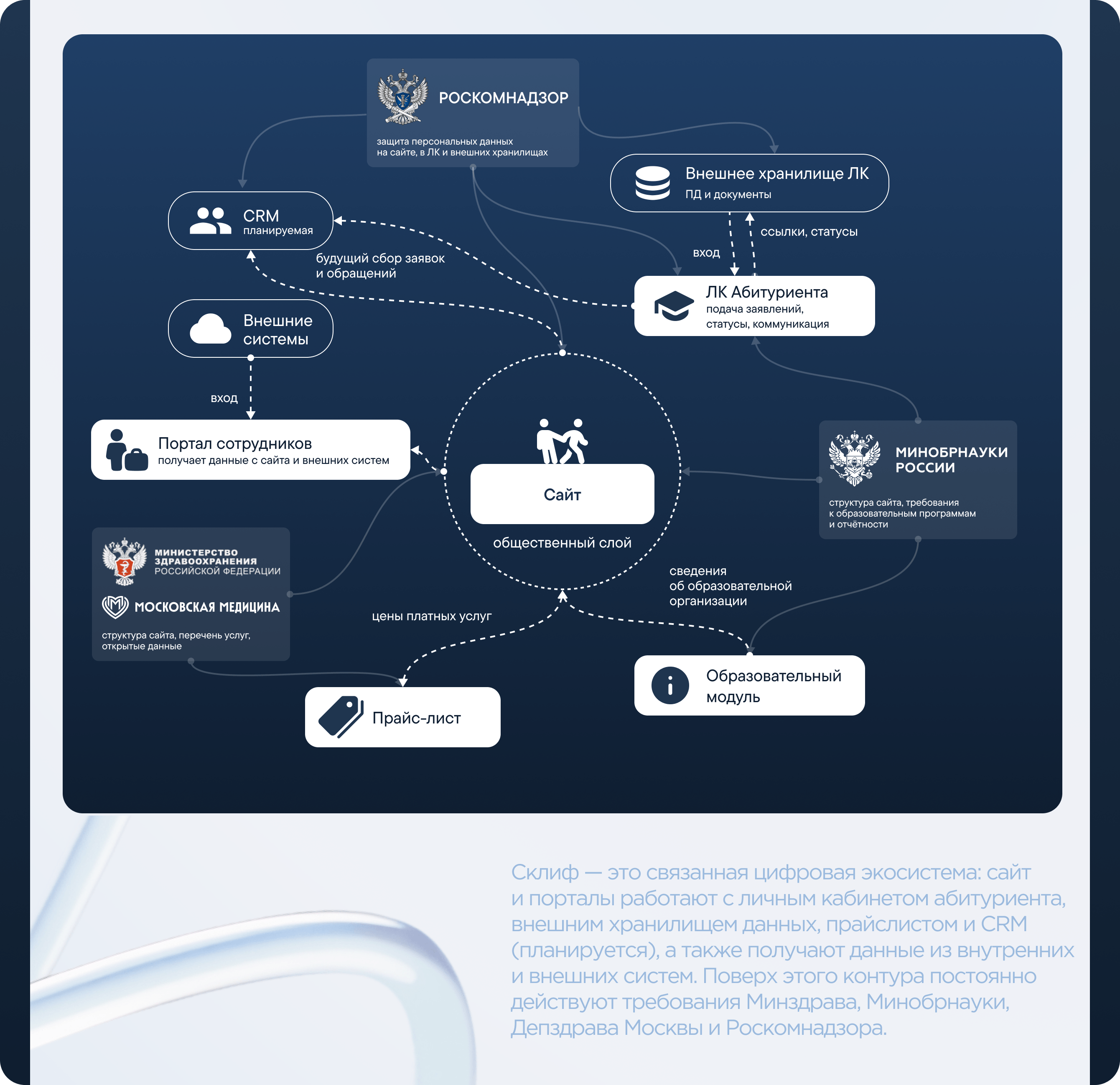 • Юридическая база: сайт привели к 100% соответствию требованиям для мед‑ и образовательных ресурсов — профильные ФЗ, приказы, обязательные разделы и форматы данных.