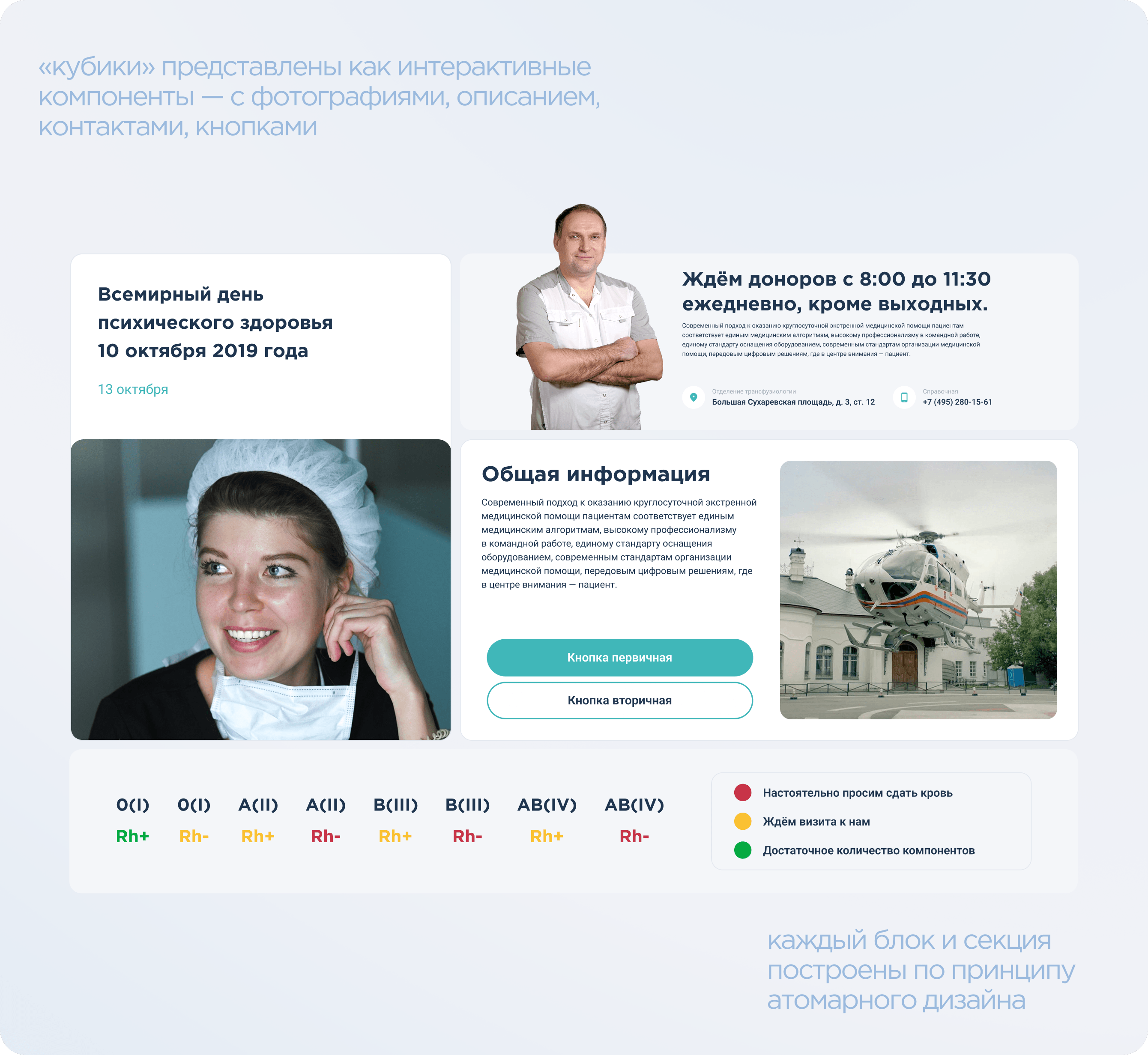 • затем из них собрали «молекулы» — карточки услуг, элементы профиля врача, строки расписания, навигационные элементы, формы;