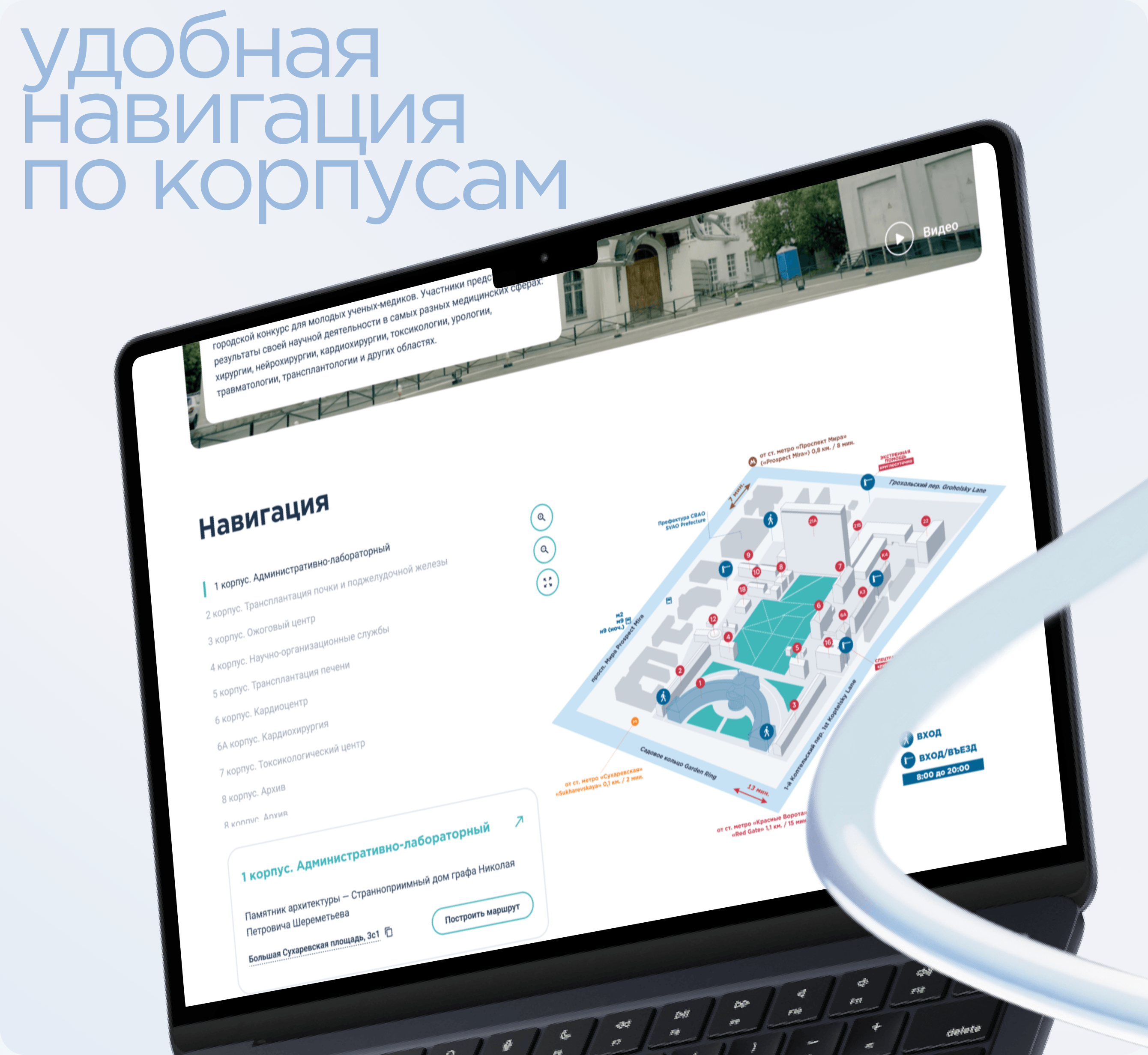 Интерактивная навигационная карта по корпусам, въездам и КПП помогает быстро сориентироваться на территории НИИ и спланировать маршрут до нужной точки. На мини-сайтах отделений встроены такие же карты с привязкой к конкретному корпусу.