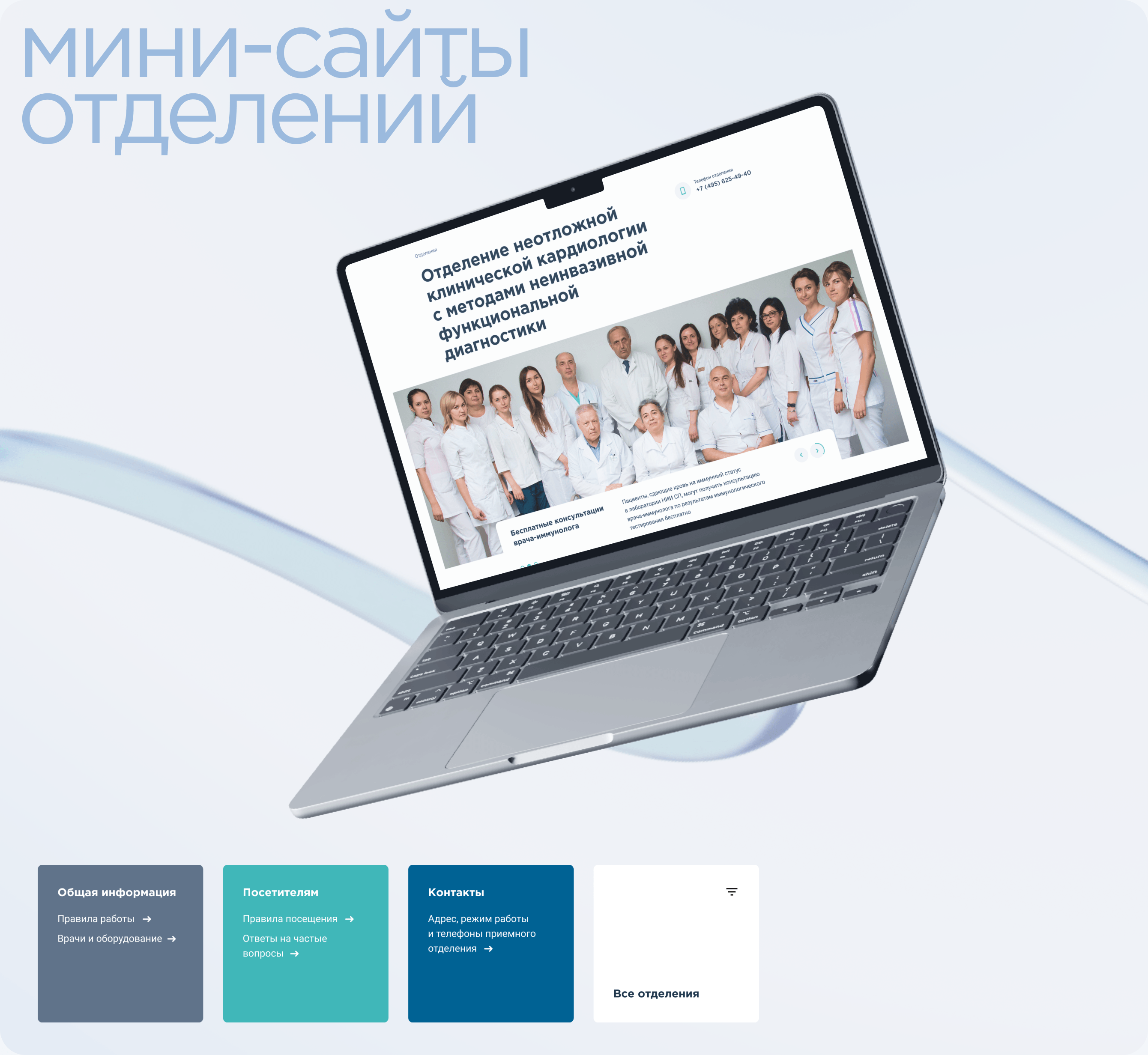 Вместе с профильными подразделениями Склифа мы реализовали множество сервисных функций — формы записи и заявок, разделы новостей, витрину научных публикаций, страницы подразделений — и на их базе запустили спецпроекты под задачи НИИ.