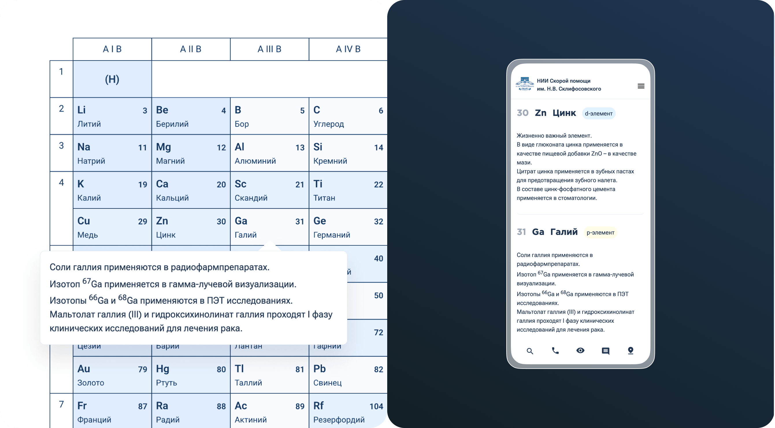 Цифровая таблица Менделеева разработана к 100‑летию Дмитрия Ивановича. Она превратила классический плакат с элементами в живой онлайн‑инструмент. Пользователь может навести на элемент и узнать, как он применяется в медицине: от диагностики и лечения до исследований. Такой спецраздел поддерживает просветительскую и научную повестку НИИ.
