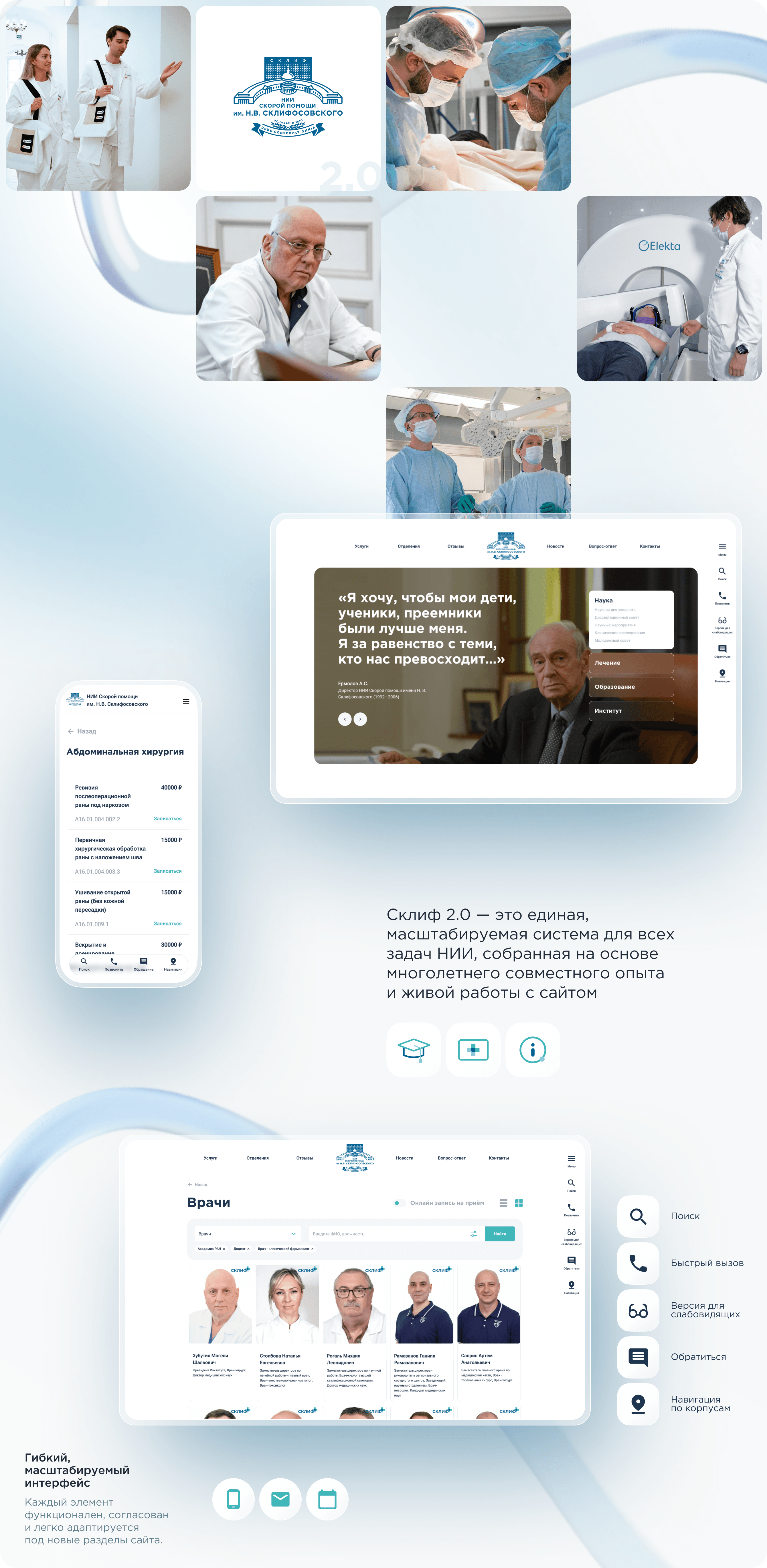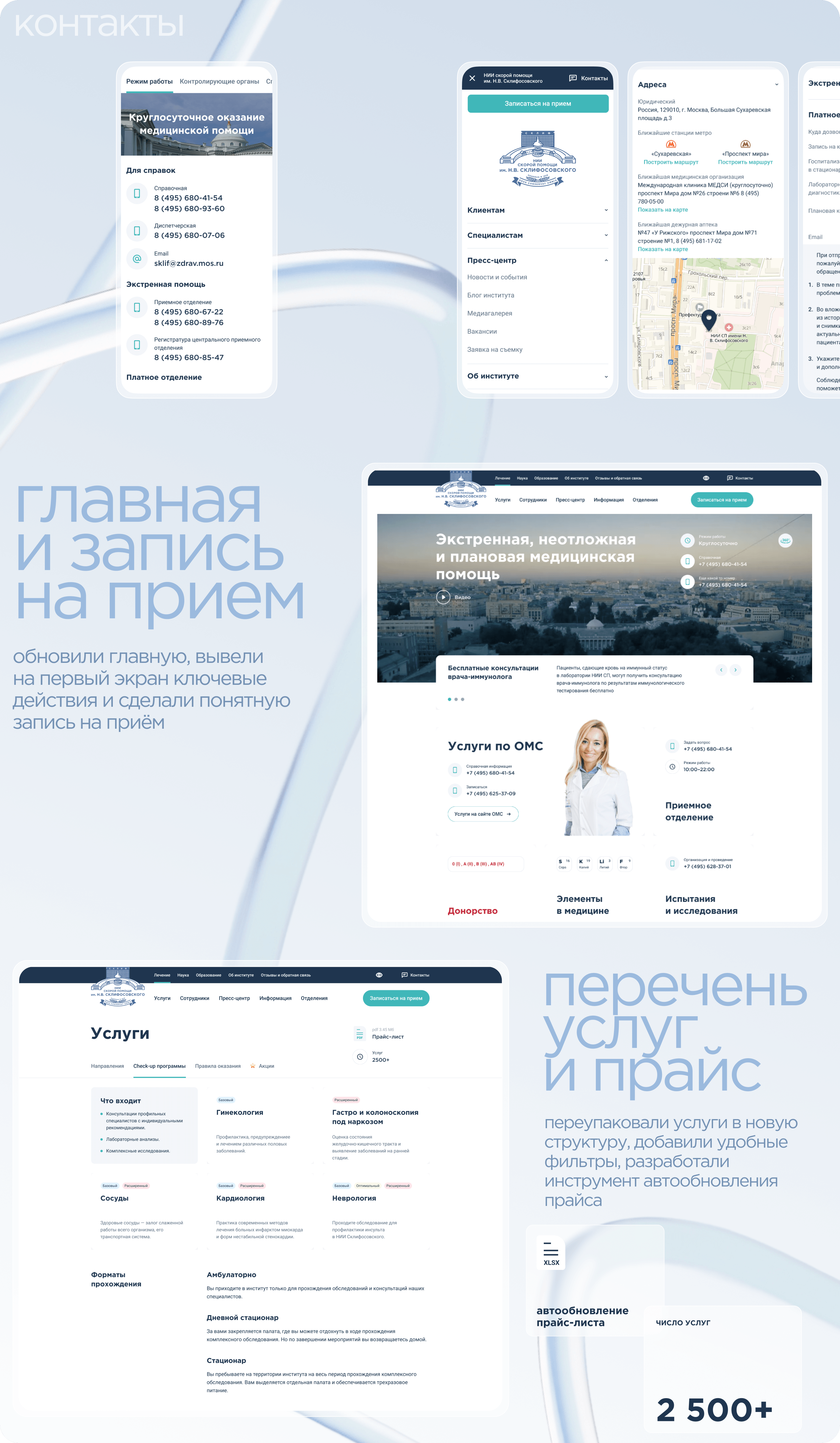 На этом этапе сайт Склифа уже стал эталонным для государственных научно‑медицинских учреждений: понятная архитектура, живой интерфейс, первые сервисы для абитуриентов и пациентов.