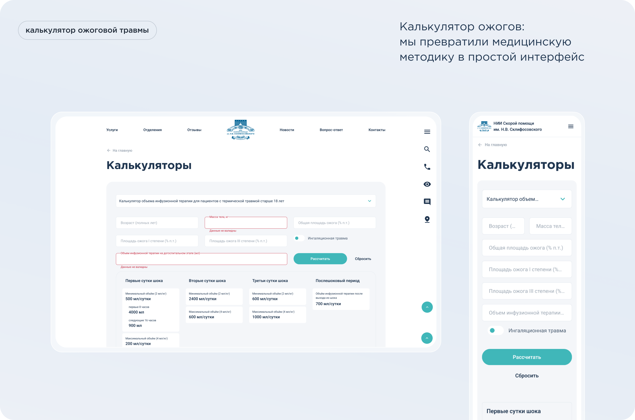 Мы аккуратно упаковали эту методику в веб‑интерфейс на сайте НИИ: инструмент помогает оценить тяжесть состояния, принять решение о маршрутизации (реанимация, профильное отделение, амбулаторное лечение) и подобрать наиболее эффективную терапию, экономя врачу минуты в критической ситуации.