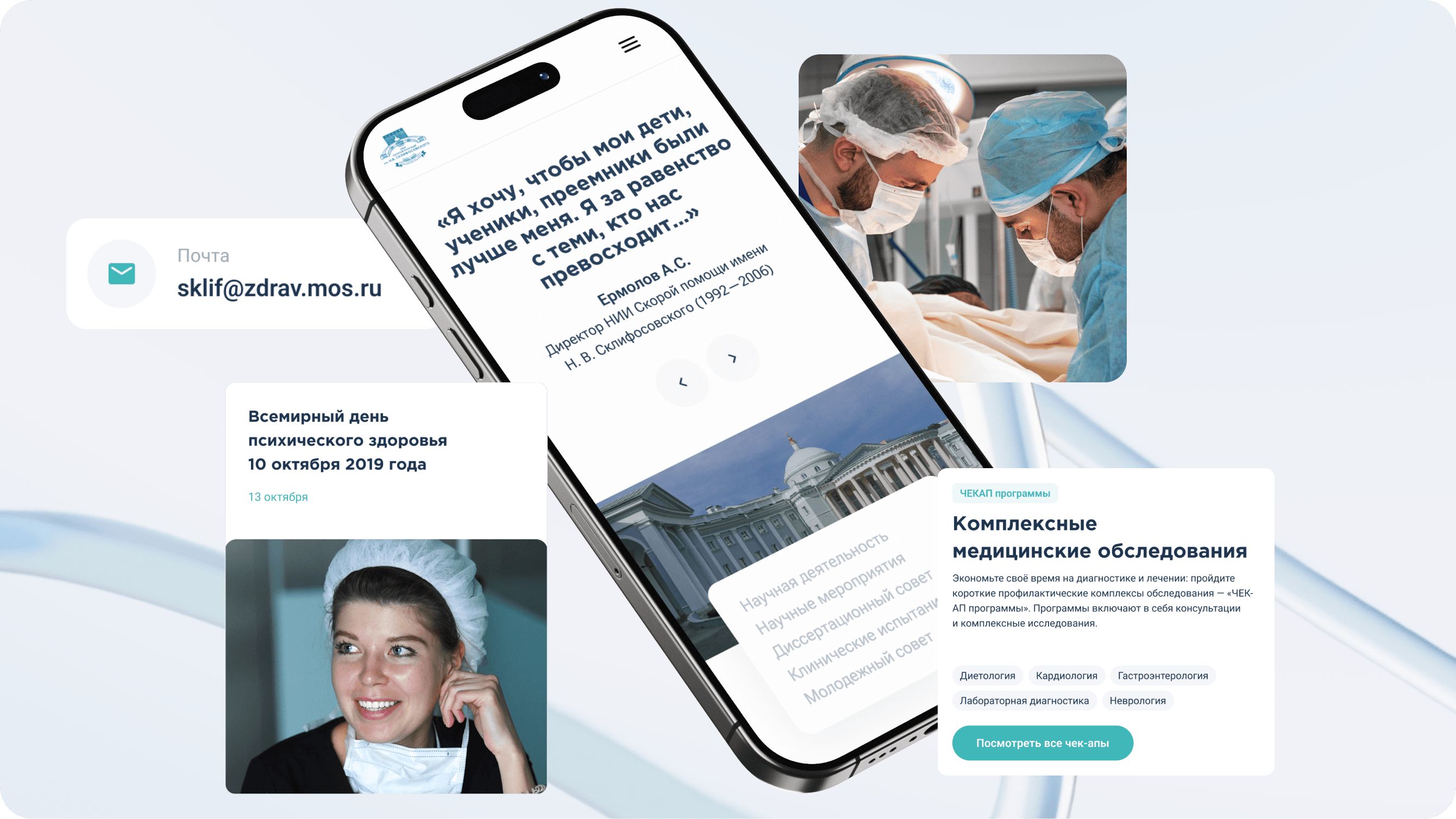 Сайт Склифа вырос в цифровую экосистему 360°: на единой платформе живут основной сайт, мини‑сайты отделений, личный кабинет абитуриента, витрина платных услуг, лендинги чекапов, страницы научных конференций и даже внутренний портал сотрудников.