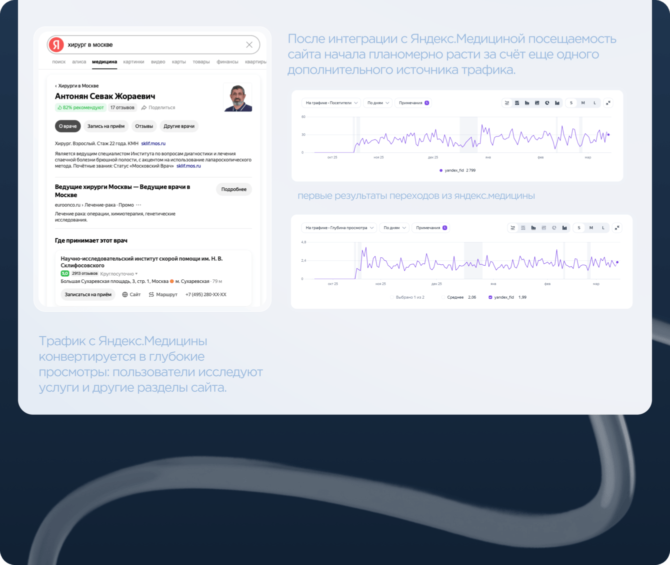 Комплексная SEO‑оптимизация, чистая архитектура, удобная навигация и контент под реальные запросы пациентов, врачей и абитуриентов плюс интеграция с Яндекс.Врачи обеспечили стабильный органический трафик.