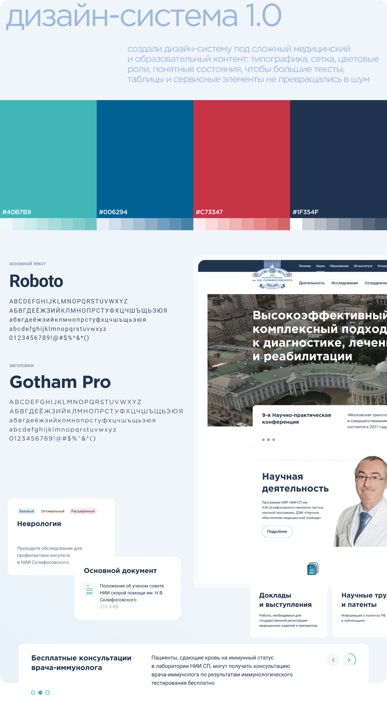 Склиф — флагманский НИИ с сильным научным сообществом. Любое решение проходит проверку не только пользователями, но и врачами, учёными, руководителями направлений. Интерфейс должен выдерживать и профессиональную критику, и реальные нагрузки.
