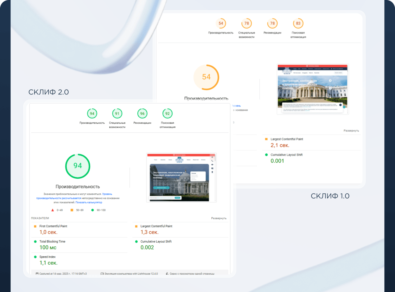 Оптимизация фронтенда и бэкенда, пересборка шаблонов, работа с медиа и кешированием, отказ от тяжёлых наследованных решений в пользу единой платформы Склиф 2.0 вывели сайт в зону лучших практик по перформансу для гос‑ и мед‑ресурсов.