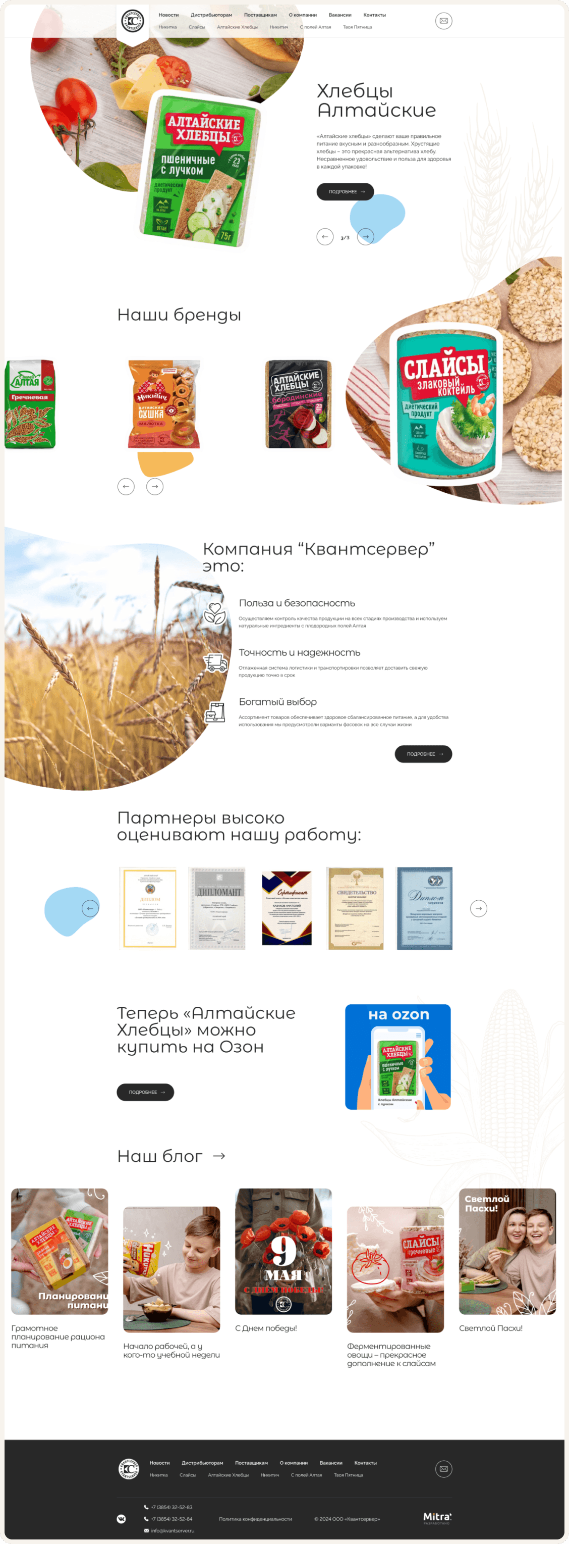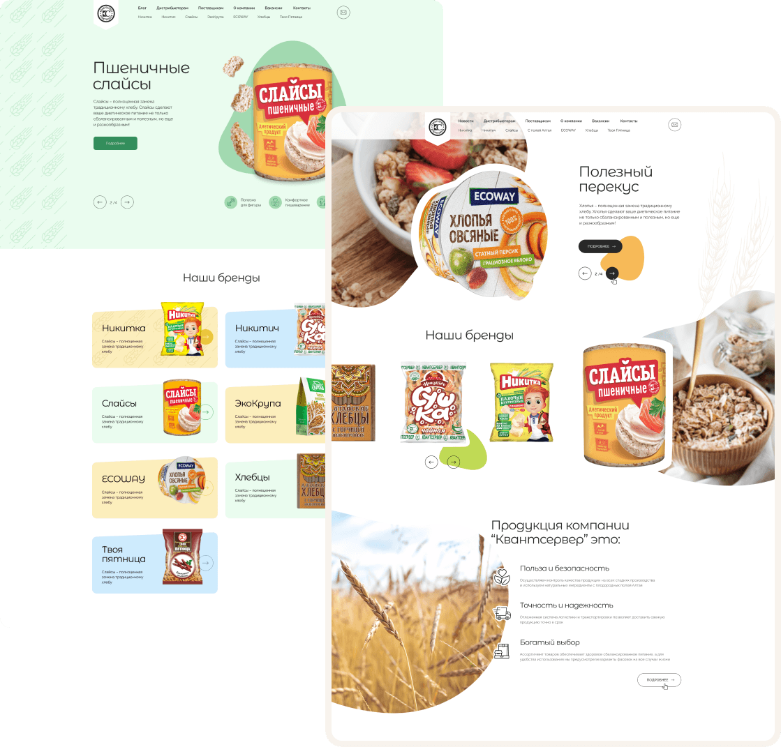 Многим известные с детства кукурузные палочки «Никитка», сушки и баранки к чаю, полезные слайсы и хлебцы — все это производит компания «Квантсервер». Ребрендинг сразу нескольких линеек продукции, желание выделить каждый бренд и подчеркнуть современный подход компании привели компанию за новым сайтом.