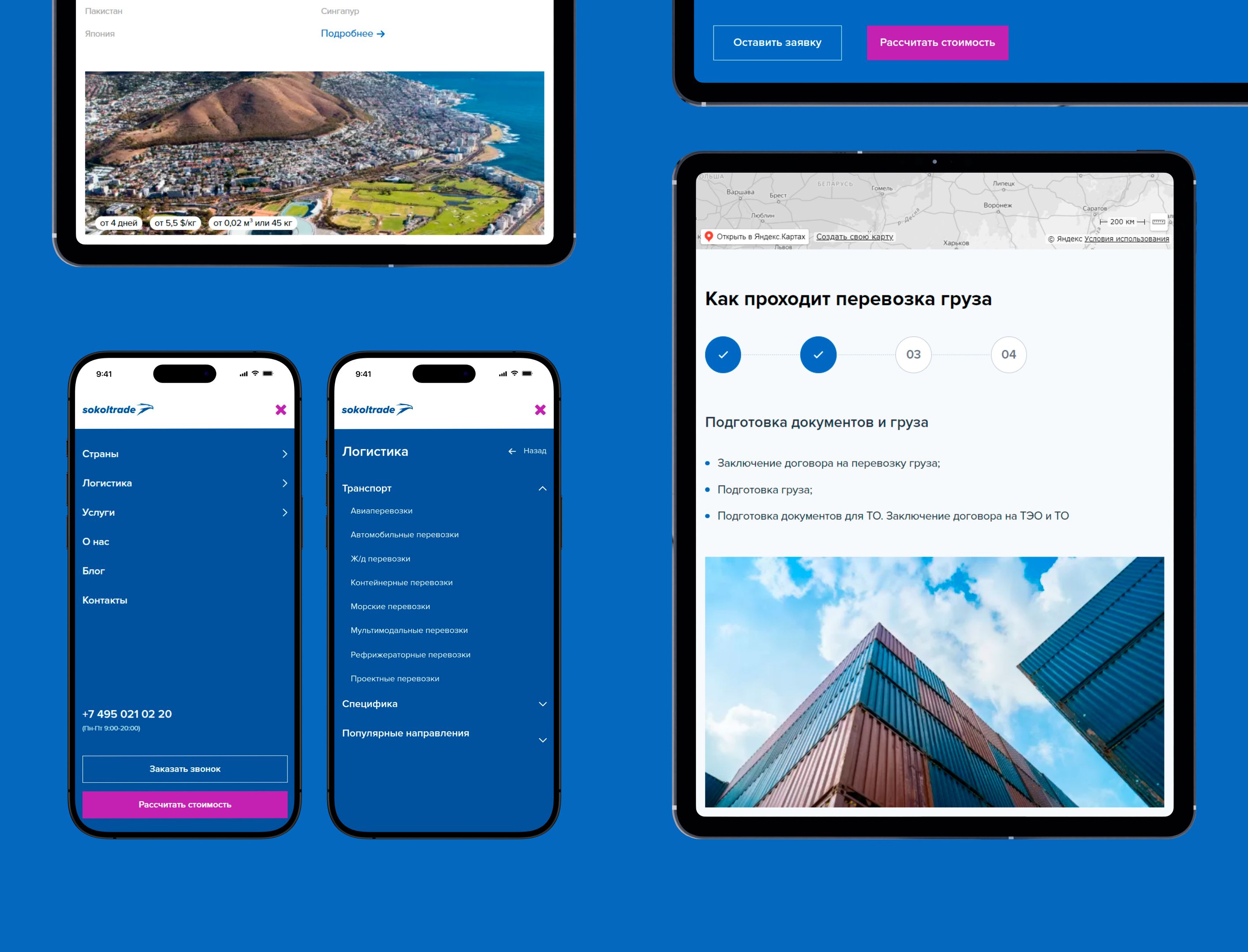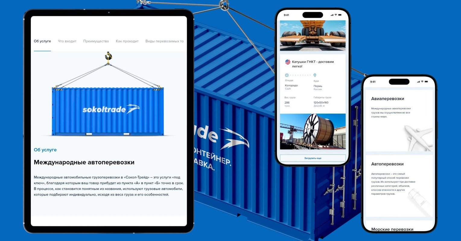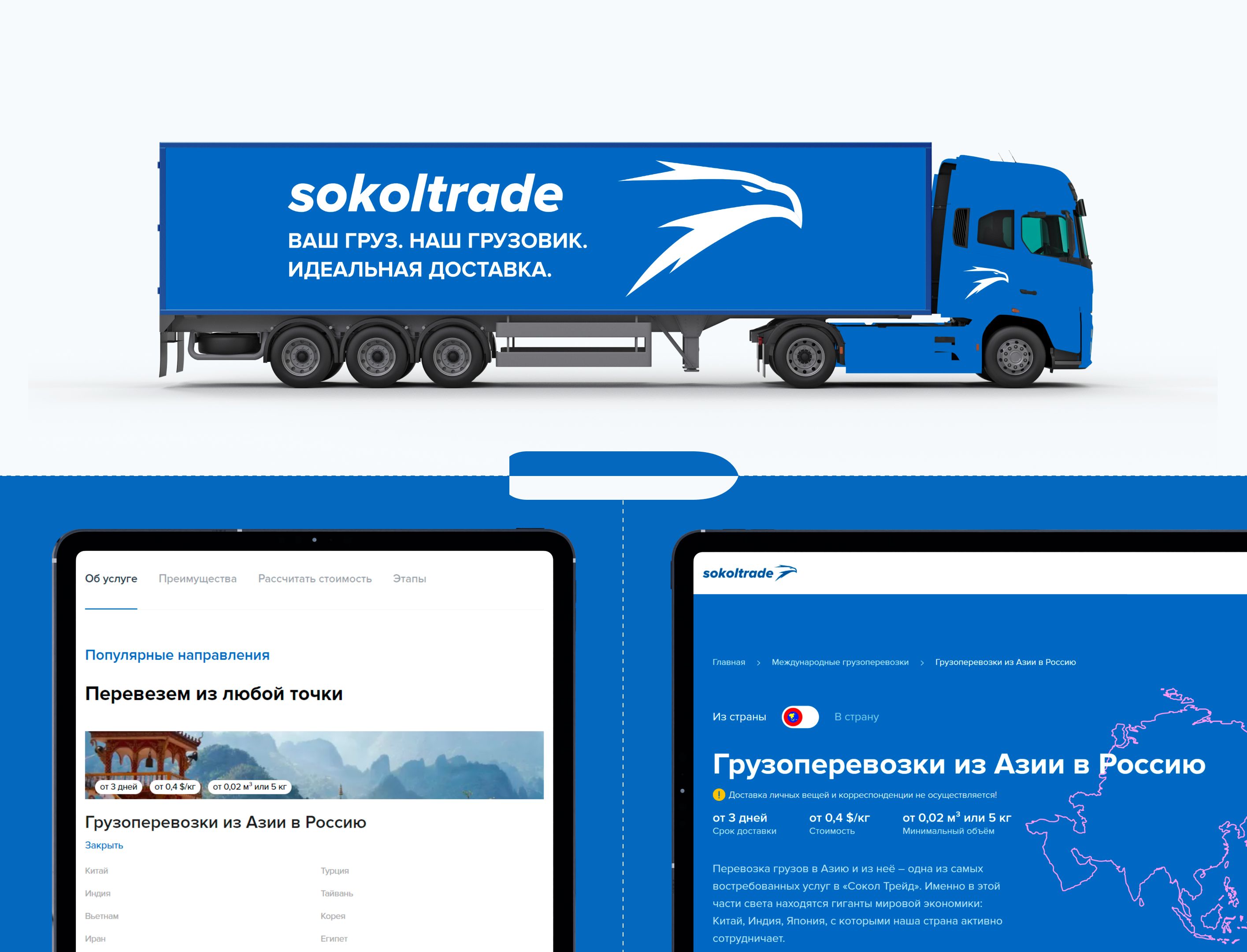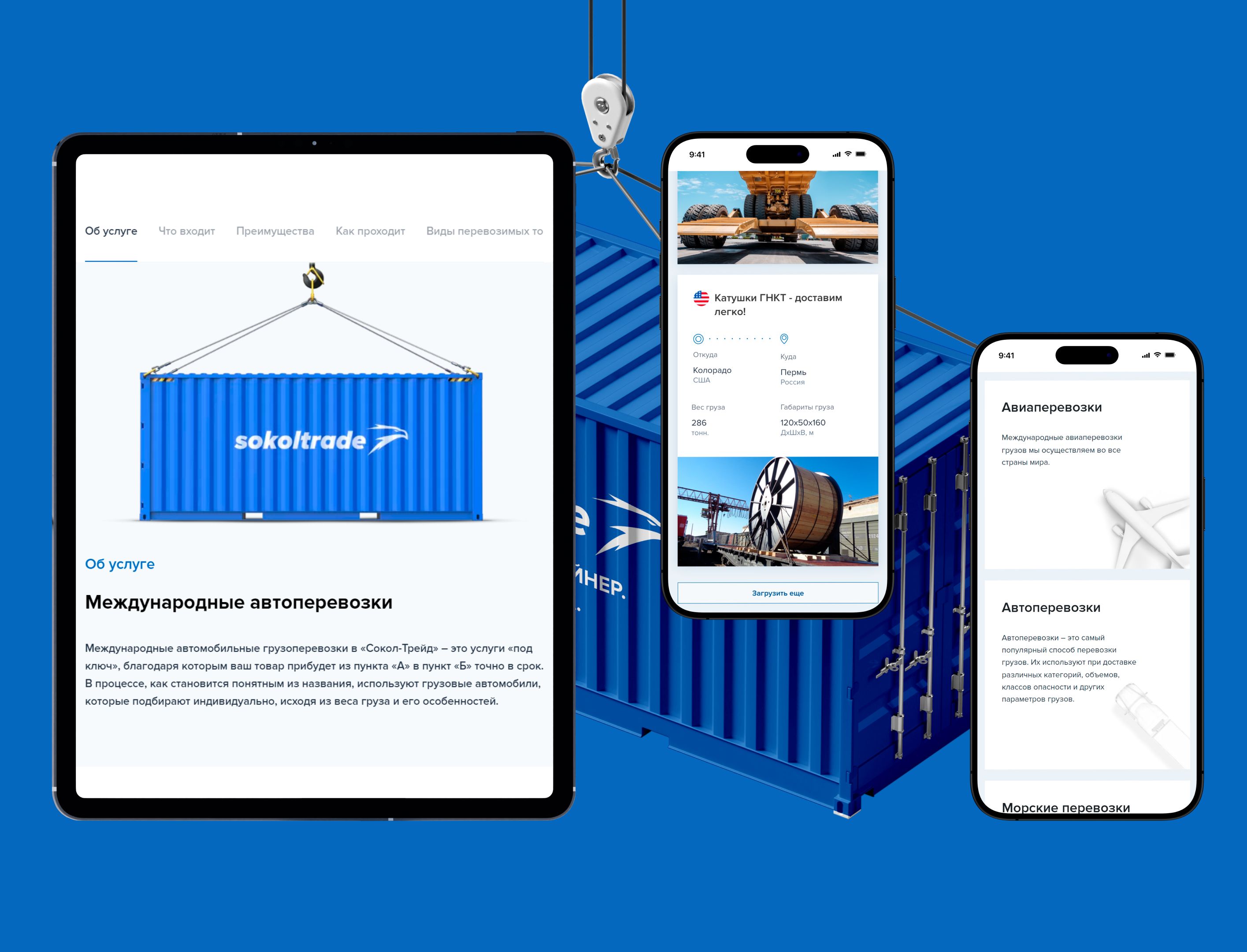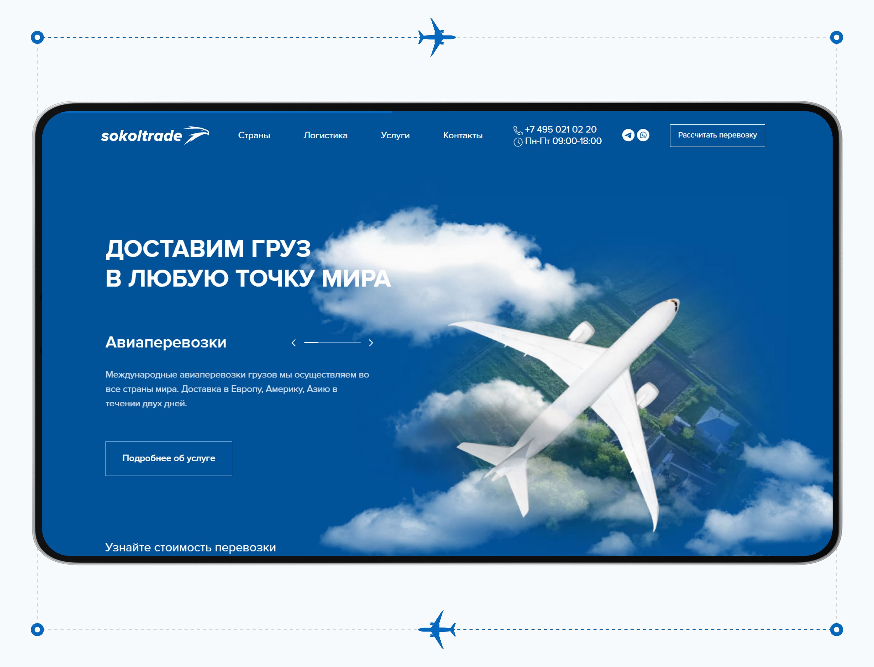 Разработать сайт для логистической компании «Сокол Трейд», который бы отражал масштаб и преимущества компании, предоставлял удобный инструмент для выбора услуг и расчёта стоимости перевозок. Сайт должен был быть функциональным, информативным и соответствовать корпоративному стилю компании.