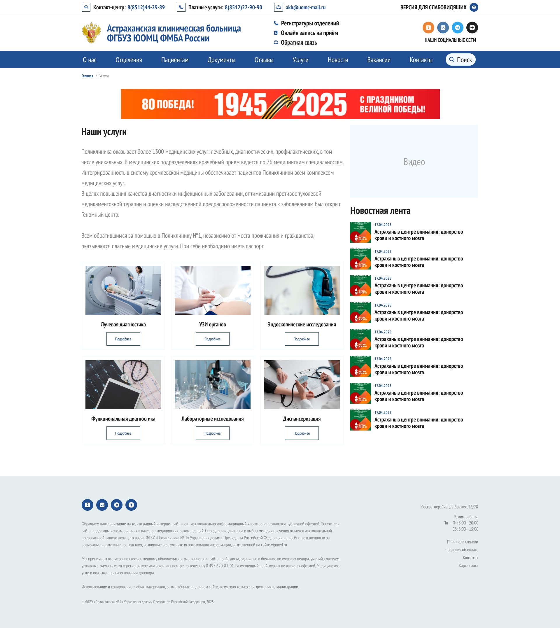 Был проведен редизайн сайта в цветах брендбука компании, добавлена версия для слабовидящих, обновлена структура страниц, добавлены новые разделы подразделений и врачей. Проработана скозная, боковая панель с видео и новостями.