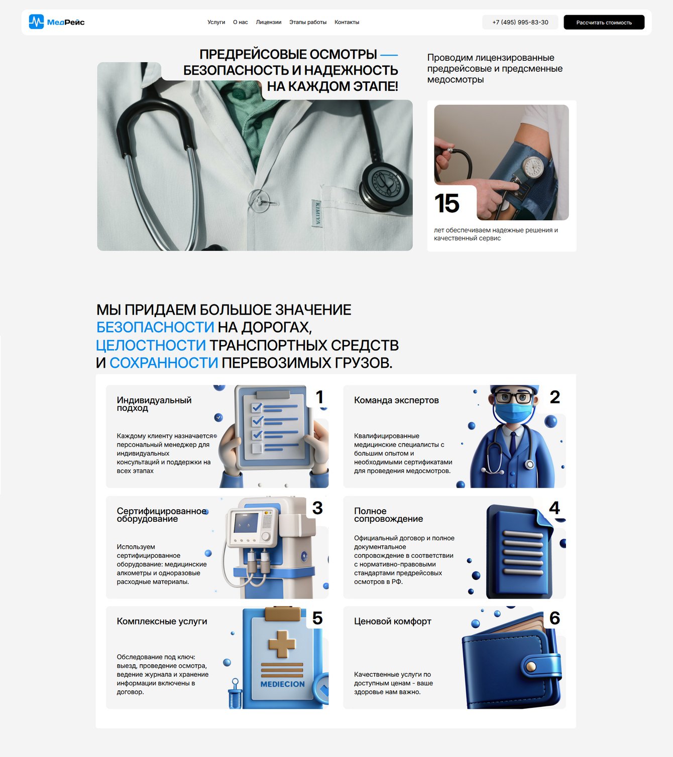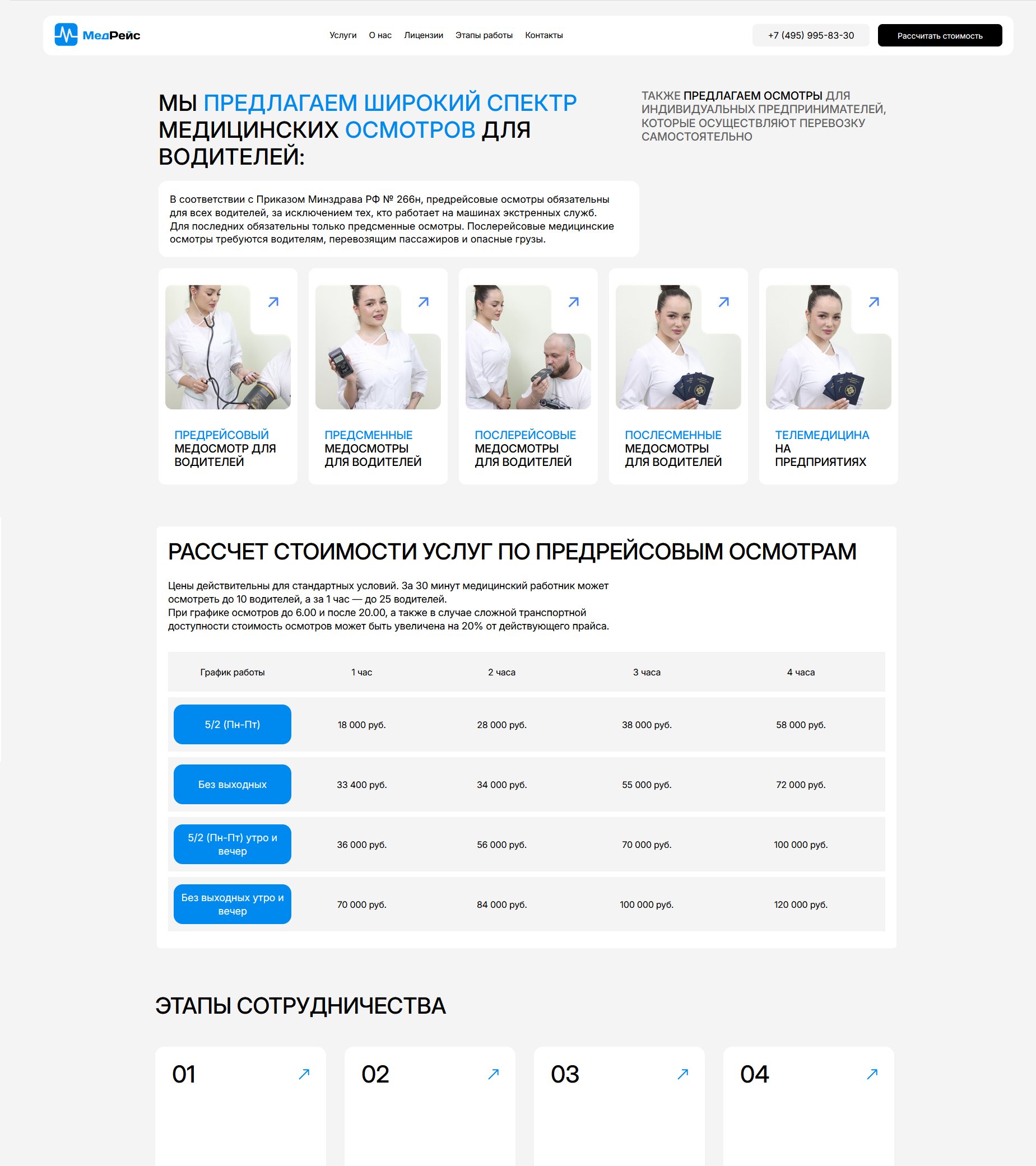 Клиент обратился для создания сайта на основе готового дизайна в Figma. Нужно было реализовать 10 типов блоков — вводный экран, преимущества, услуги, стоимость, этапы сотрудничества и оказания услуг, FAQ, документацию и лицензии, форму расчета и заявки, карту проезда. Сайт должен быть адаптивным для всех устройств, кроссбраузерным и с удобной административной панелью для редактирования контента.