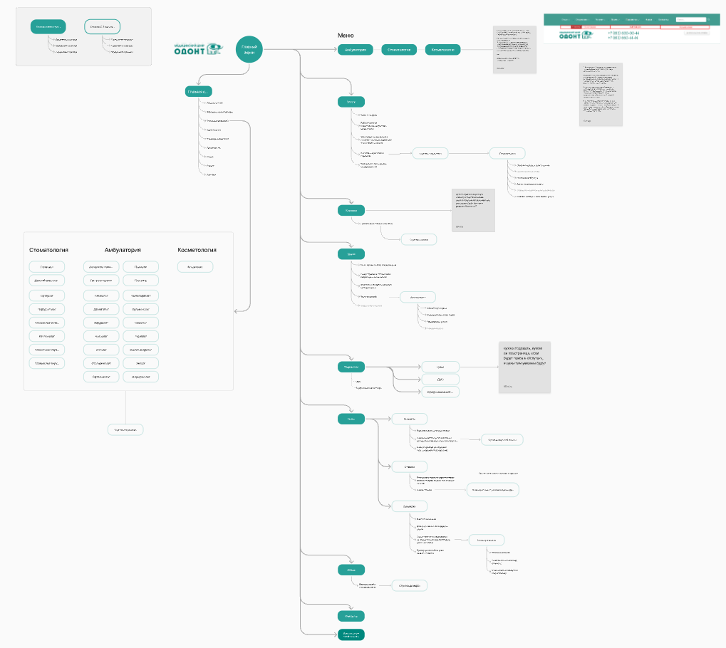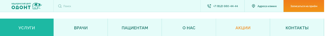 1. Первый уровень содержал логотип, поиск, номера телефонов, кнопки «Адреса клиник», «Личный кабинет» и кнопку записи на приём.