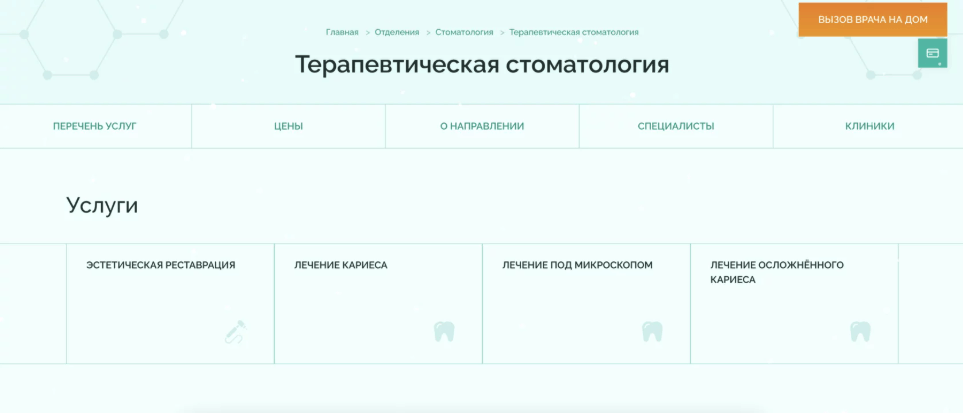 Так выглядит страница направления — здесь мы отразили перечень контентных страниц с услугами, список цен на все услуги и врачей направления, а также адреса клиник, в которых оказываются данные услуги.