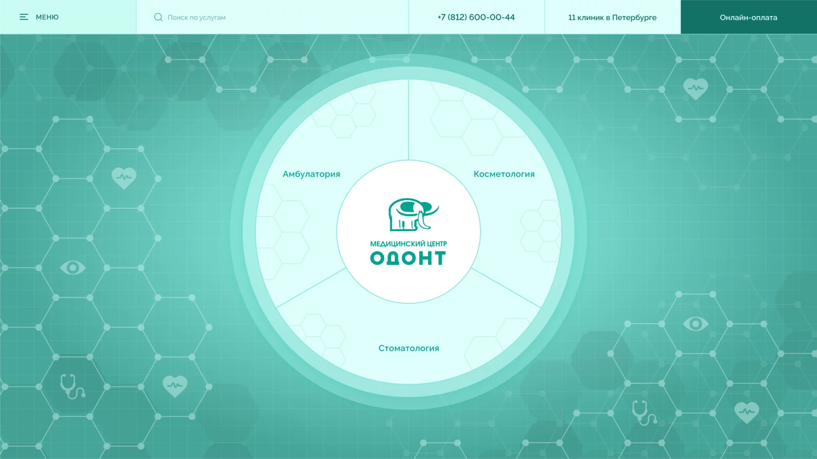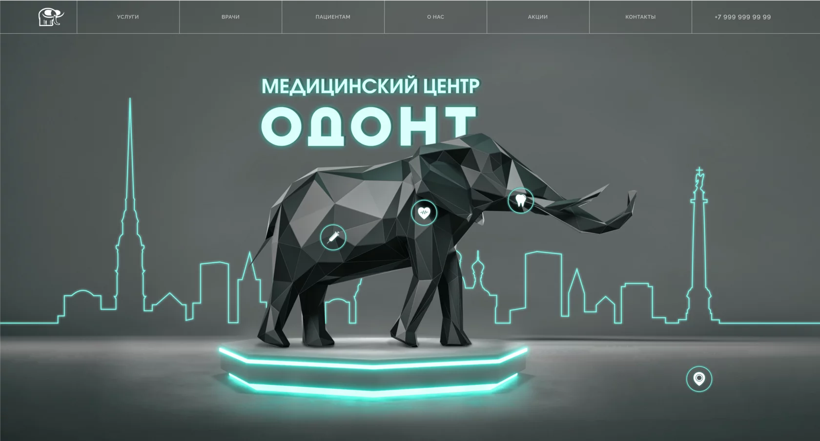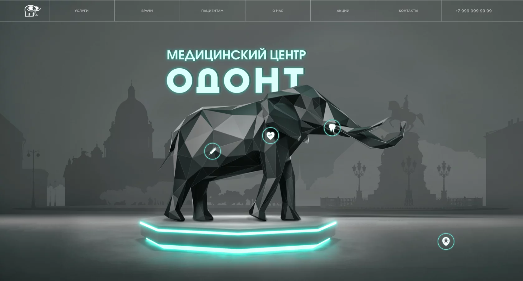 Кстати, одна из первых дизайн-концепций входа на сайт. Заказчик очень хотел слона при попадании на сайт и наша студия предложили креативное решение, которое смотрелось «дорого» или необычно. Образ забавного слоника из логотипа мы преобразовали в солидную фигуру слона, намекая сходством на многочисленные статуи и монументы Санкт-Петербурга, на которой разметили три подразделения клиники: амбулатория, стоматология и косметология.