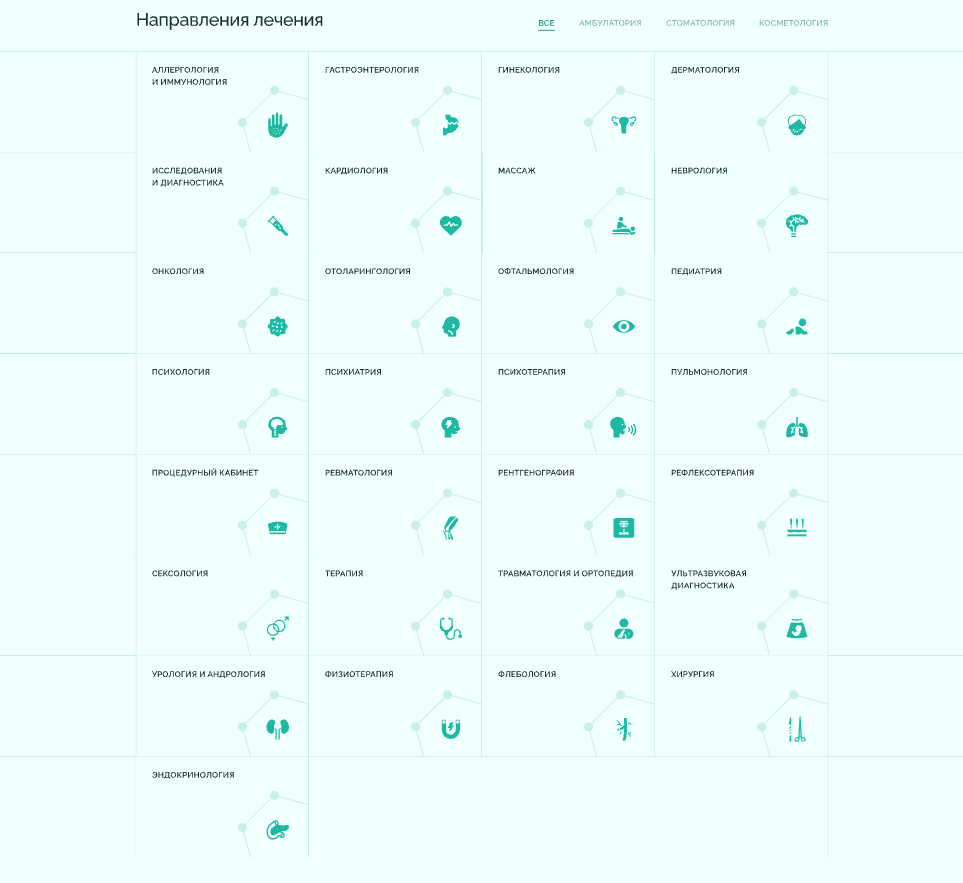 Дальше мы сделали акцент на направлениях услуг. Каждому направлению была присвоена своя собственная иконка.