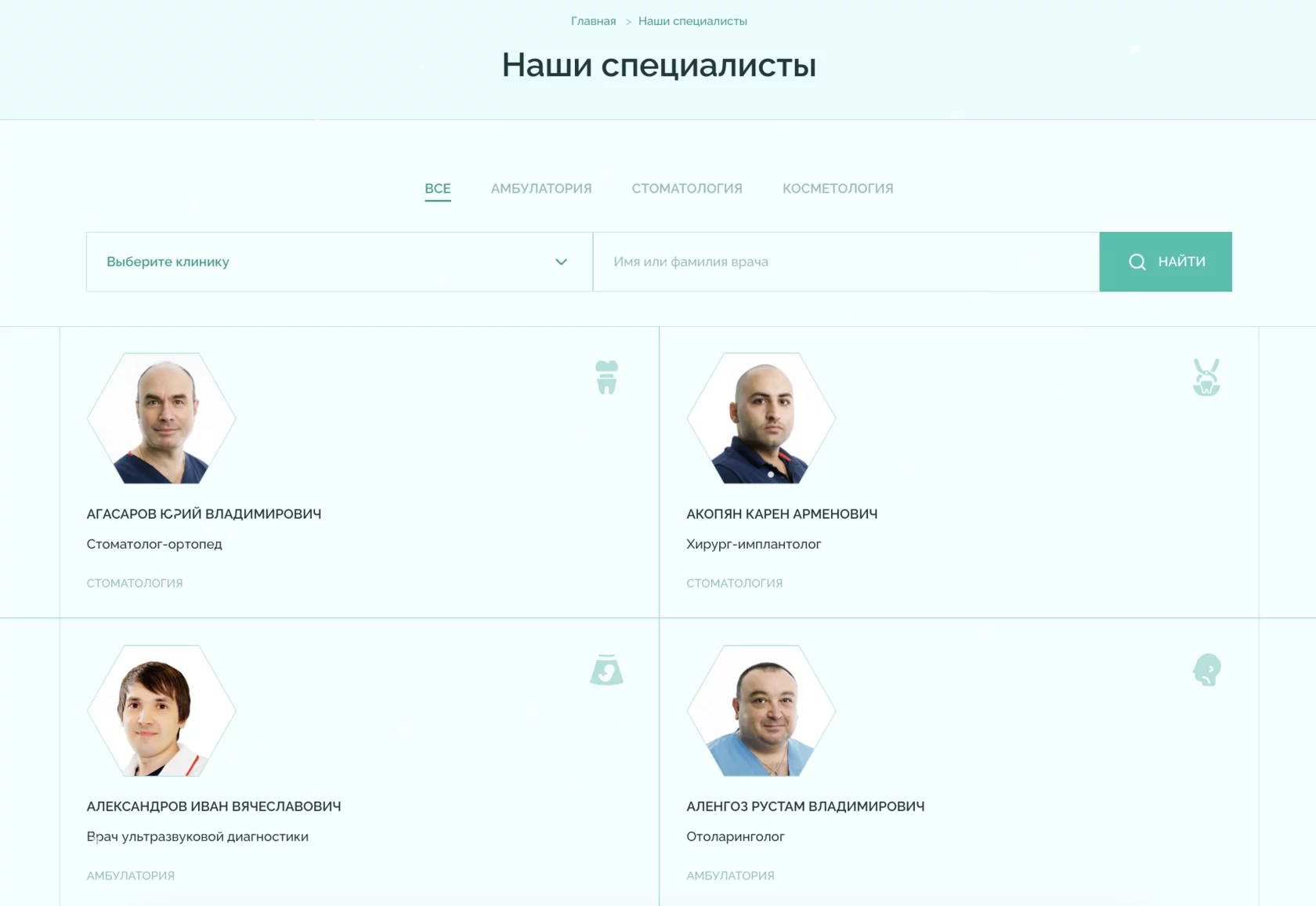 На странице с врачами предусмотрена фильтрация по трём подразделениям клиники, а также по адресам, где принимают специалисты. Можно быстро найти нужного врача по имени или фамилии.