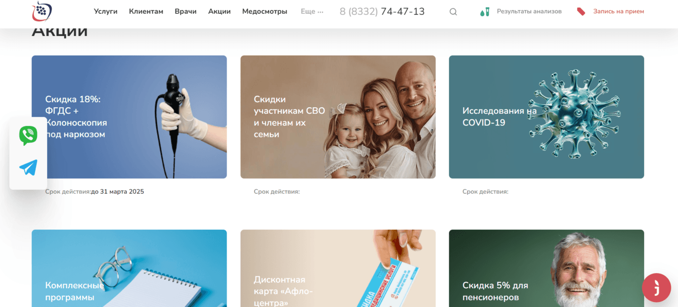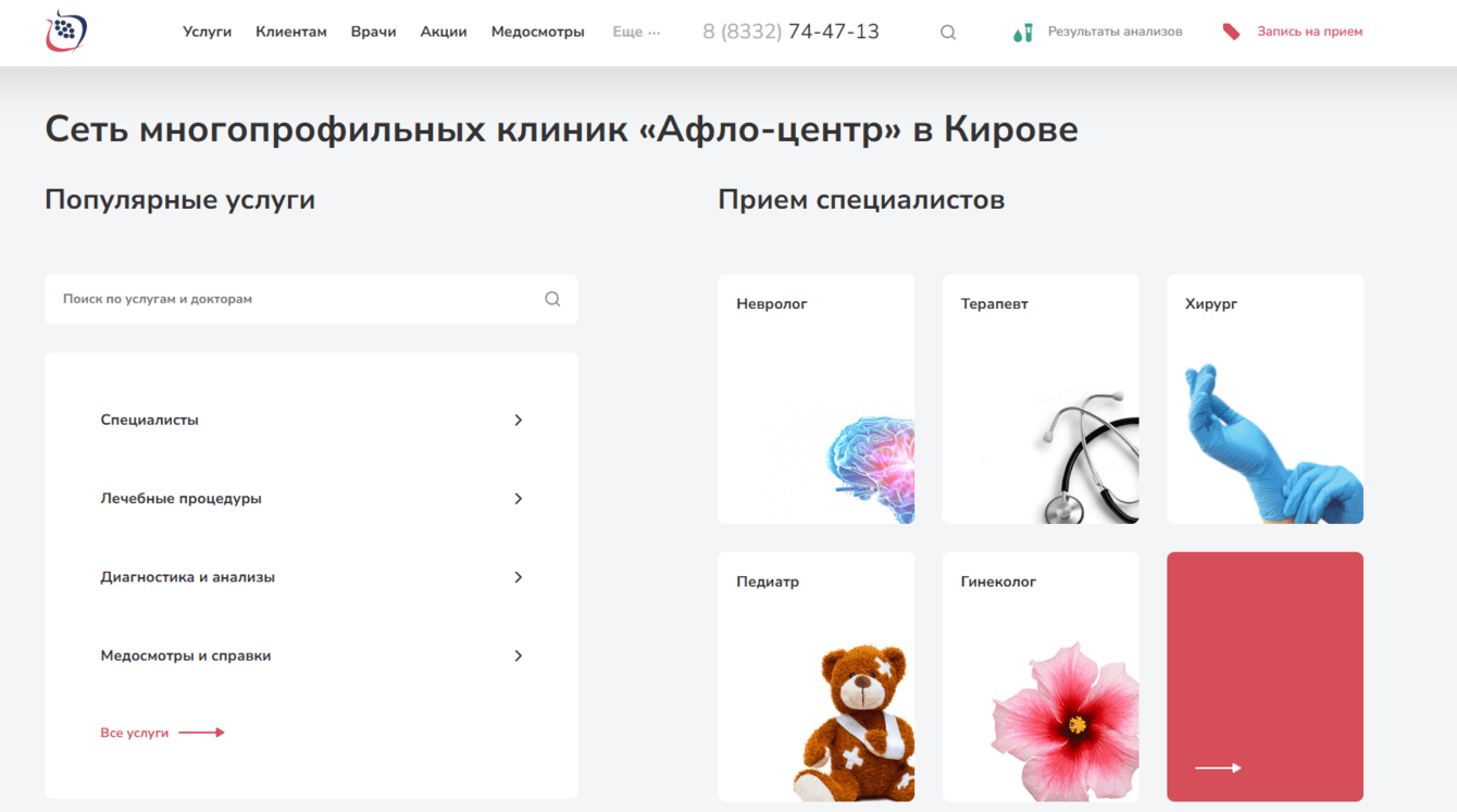 Разработка сайта для сети медицинских клиник «Афло-центр» стал амбициозной задачей, требующей комплексного подхода. Нам предстояло не просто обновить сайт, а полностью перестроить его структуру, дизайн и функциональность, обеспечив удобство как для пациентов, так и для сотрудников клиники.