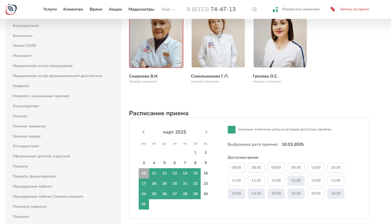 Одной из главных сложностей была необходимость автоматизировать процессы, ранее информация о врачах, услугах и ценах заполнялась вручную, что приводило к неактуальным данным и значительным временным затратам. Мы синхронизировали сайт с системой учета, что позволило автоматически выгружать услуги, врачей и их расписание. Теперь пациенты могут в реальном времени записываться на приём с выбором врача и филиала, а данные синхронизируются с системой учёта.