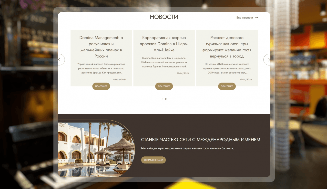 Получили задание создать индивидуальное решение, которое отражало бы дух итальянского гостеприимства Domina и обеспечивало интуитивно понятный интерфейс для пользователей, позволяющий исследовать отели, услуги и актуальные новости компании.