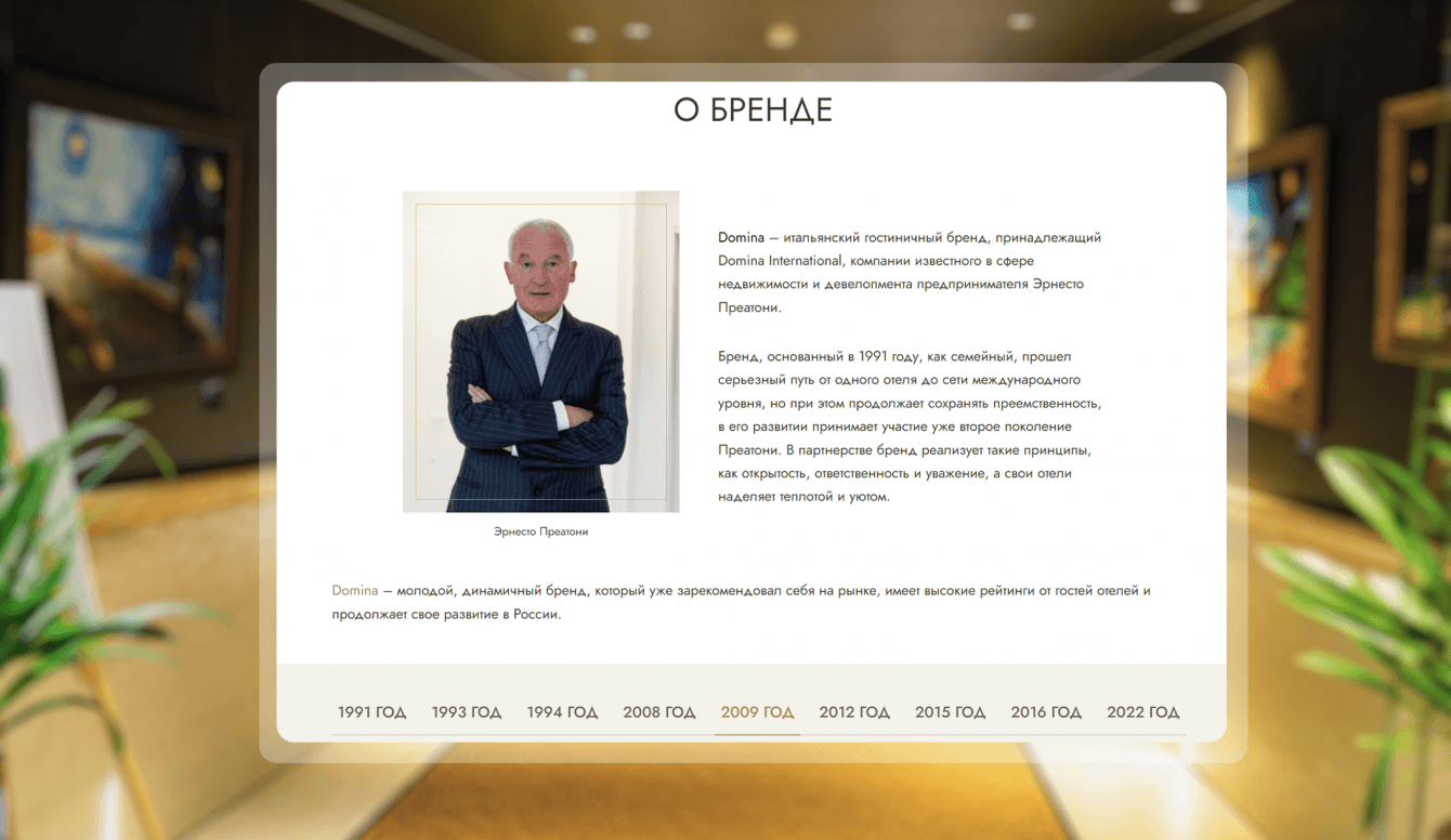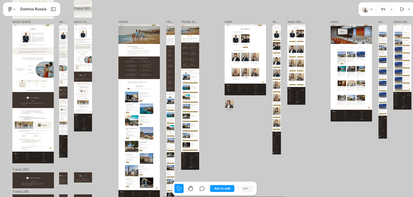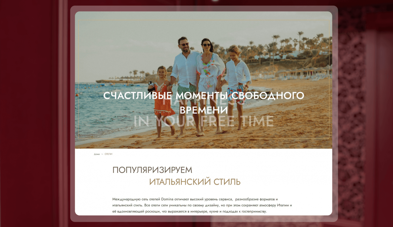Начали с глубокого изучения концепции и философии бренда Domina. Важно было понять уникальные традиции гостеприимства, ценности и принципы, которые передаются из поколения в поколение. Изучили брендбук компании и смогли сформировать уникальный дизайн, который отражает идею Domina.
