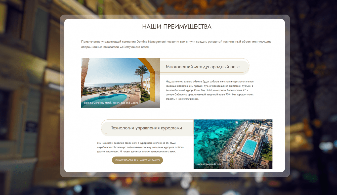 Кроме того, сайт способствует увеличению продаж, предоставляя пользователям полную информацию об услугах, специальных предложениях и акциях, что стимулирует их к бронированию и использованию услуг отелей сети Domina. Эффективная презентация услуг и удобство бронирования напрямую влияют на рост доходов компании.