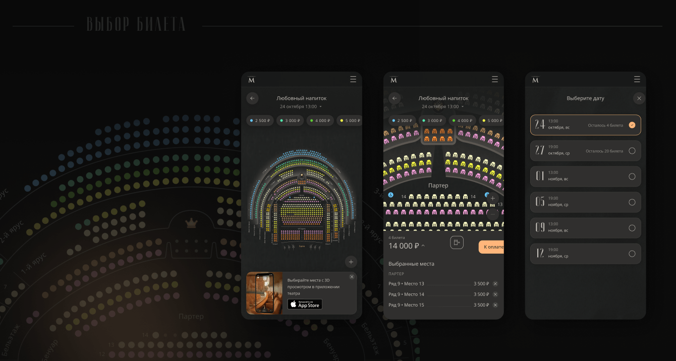 В визуальном решении сохранили атмосферную стилистику мобильного приложения: воссоздали атмосферу богемности театра, передали энергетику зала с запахом пыльного бархата и пудры.