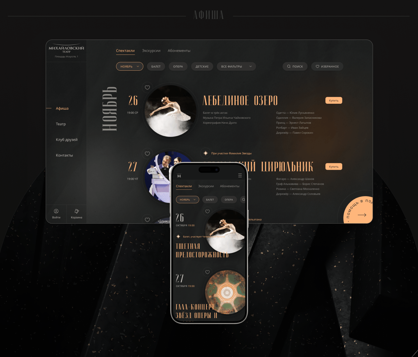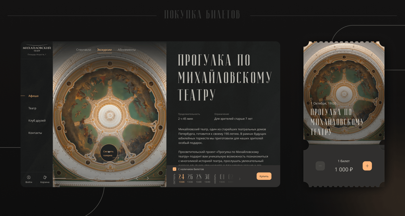 Михайловский — один из главных театров Санкт-Петербурга, распахнувший свои двери для зрителей ещё в 1833 году. Мы уже делали для Михайловского театра атмосферный и удобный дизайн мобильного приложения, где можно виртуально прогуляться по театру, а затем выбрать и купить билеты на спектакль.