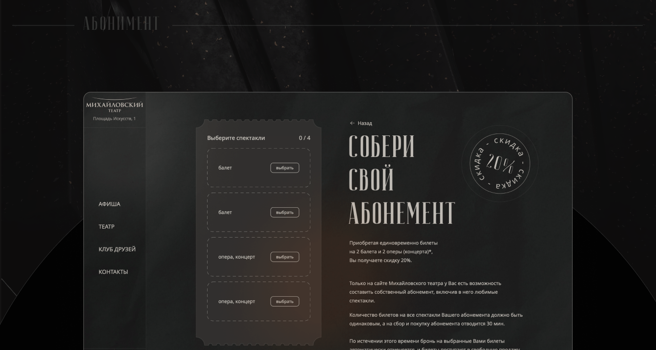 На сайте можно собрать абонемент на посещение нескольких спектаклей и сэкономить 20% с каждого билета. Найдите постановки по душе, выберите комфортные места и спланируйте свой досуг заранее.
