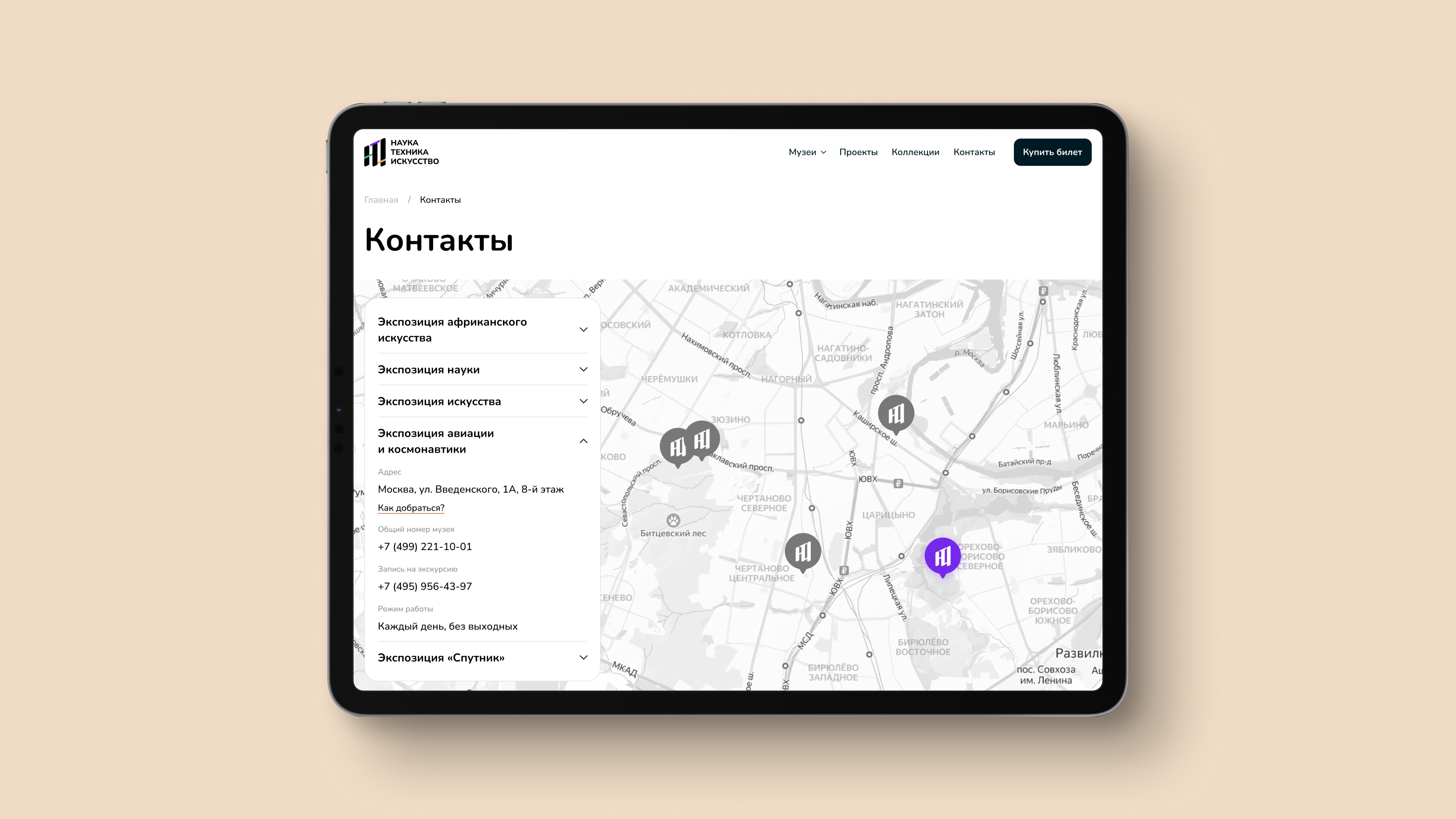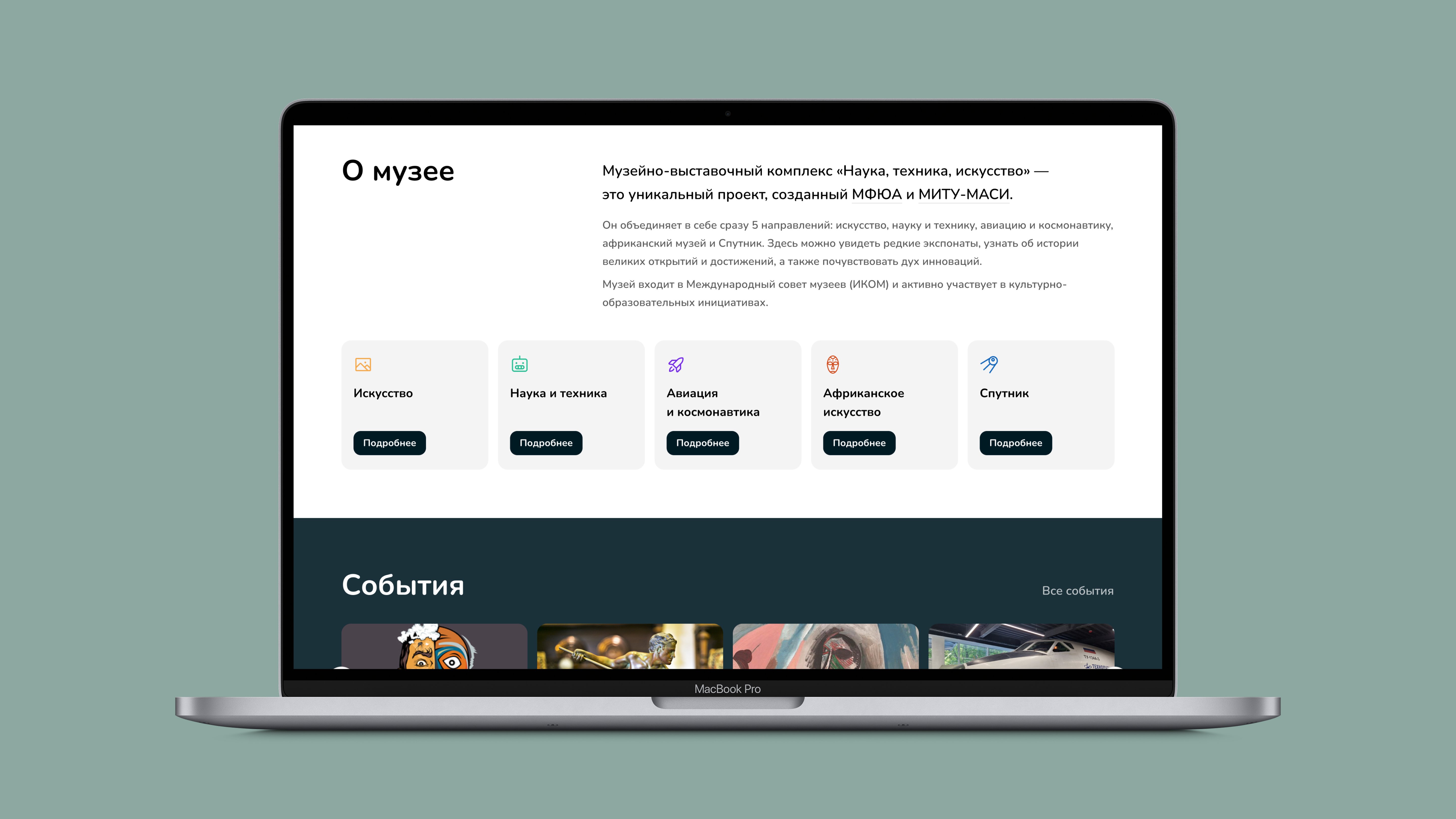 Главная страница помогает быстро найти нужную информацию. Все разделы чётко структурированы — это позволяет посетителям легче искать нужную информацию. На главной странице также реализованы важные функции, такие как онлайн-запись на экскурсии, покупка билетов и просмотр детализированных страниц экспонатов. Адаптивный дизайн сайта обеспечивает комфортный просмотр на любых устройствах.