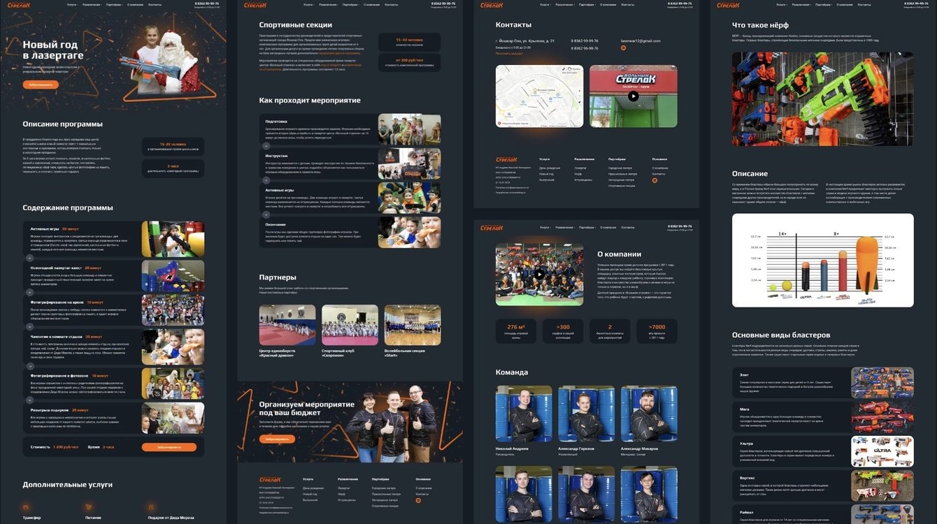 На странице показаны важные для клиентов «Вольного стрелка» моменты — перечислены услуги, показаны отзывы, информация о том, как добраться, ответы на частые вопросы и форма заявки.
