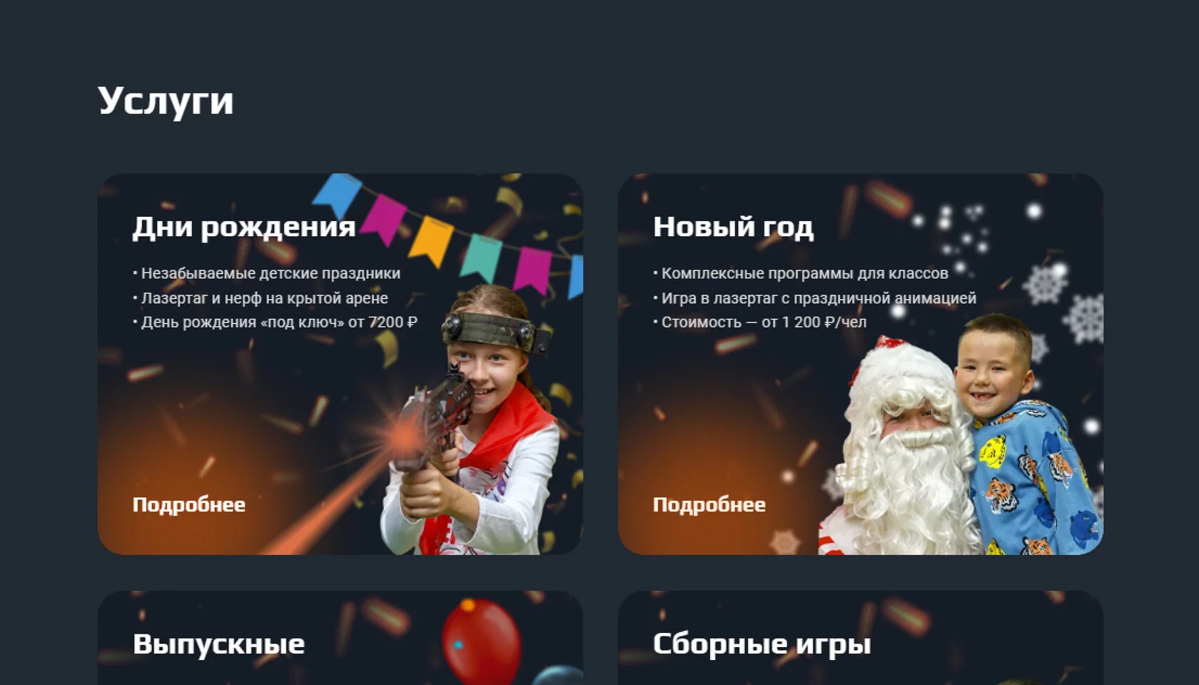 Необходимо обновить существующий ранее сайт и адаптировать его под основные задачи продвижения компании. Важно, чтобы на сайте были страницы под поисковые запросы об организации дня рождения, выездной игры или другого детского мероприятия. Заявки с сайта нужно мгновенно перенаправлять менеджерам, которые связываются с каждым индивидуально.