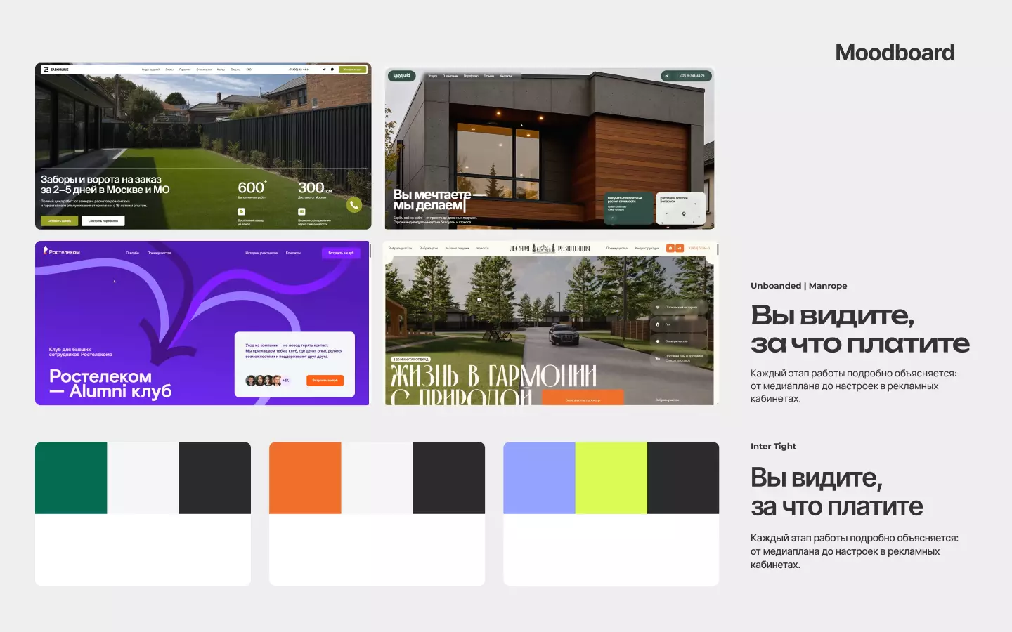 Перед отрисовкой дизайна собрали мудборд. На звонке с клиентом посмотрели собранные референсы. Обсудили подход к визуальной подаче — какие решения, шрифты и цветовая гамма подходят для проекта.
