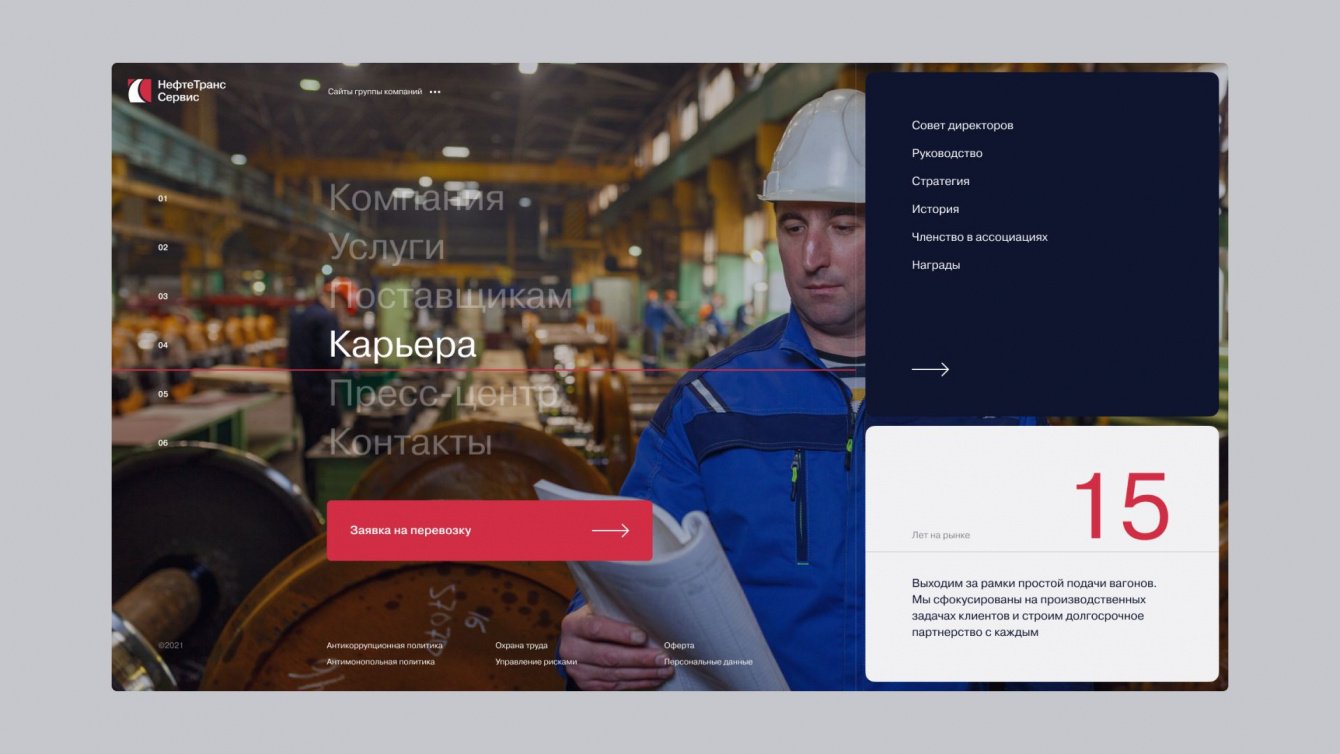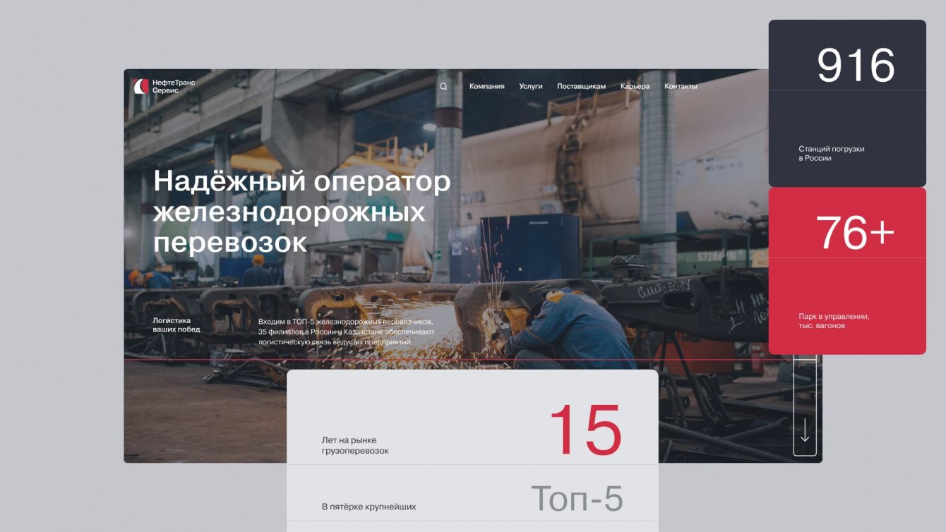 Для создания дизайна сайта развили стиль и адаптировали его под задачи цифровой среды. Важна была максимальная достоверность визуала. Так ливреи на моделях вагонов и сами вагоны точь-в-точь, как в жизни. Фактически для проекта мы оцифровали вагоны, вагон-цистерны и локомотивы, которые использует в работе НТС и усилили ими интерфейс.