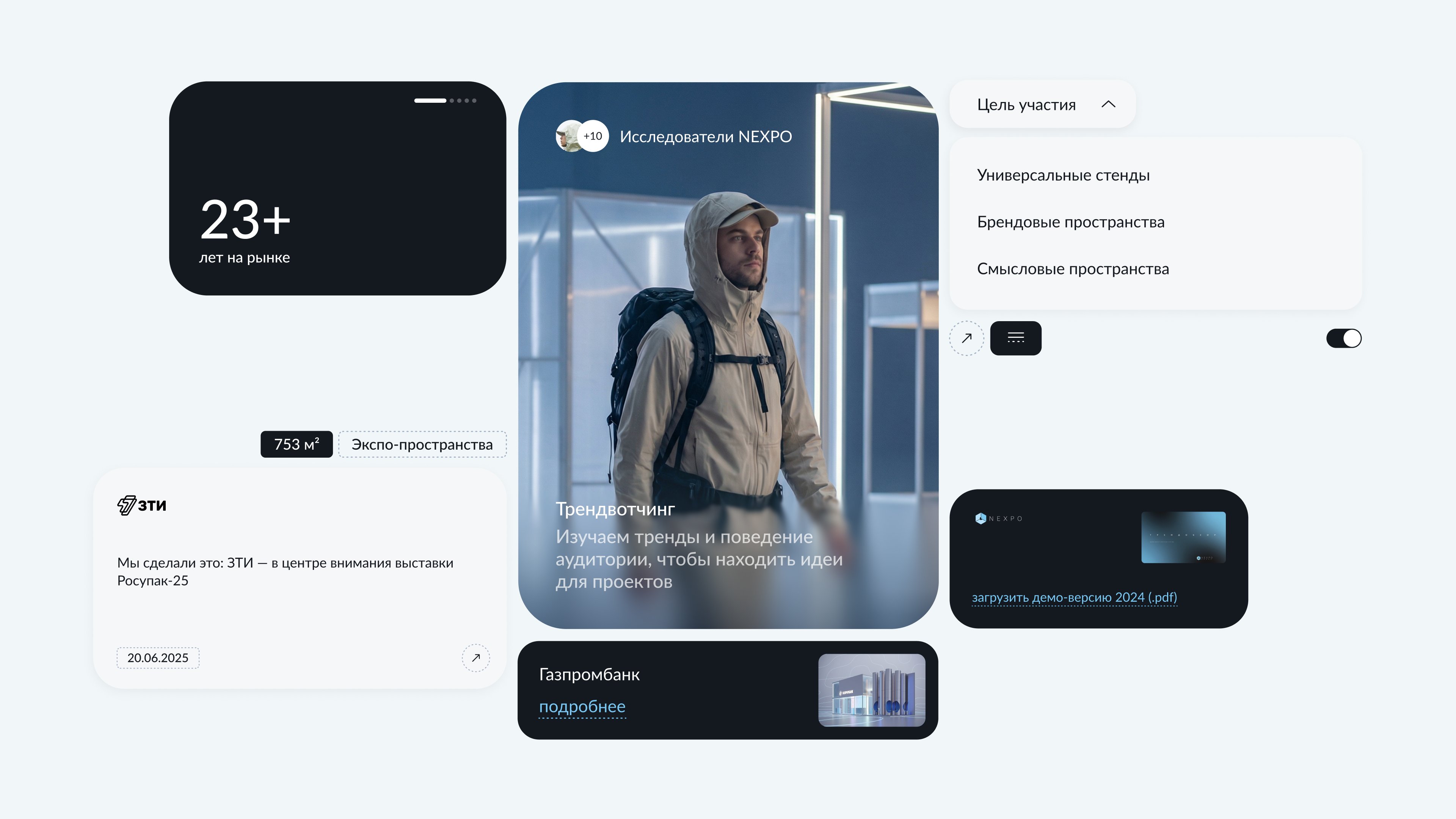 NEXPO — это одновременно исследователь, который глубоко погружается в задачу, и инженер, который точно реализует идею в пространстве. В результате нашей работы визуал должен отражать оба этих качества.