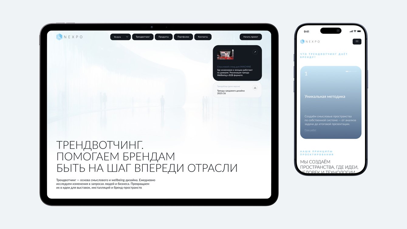 Мы перестроили структуру, логику подачи услуг и тексты так, чтобы пользователь сразу понимал: NEXPO предлагает не просто застройку, а исследовательский подход к пространству.