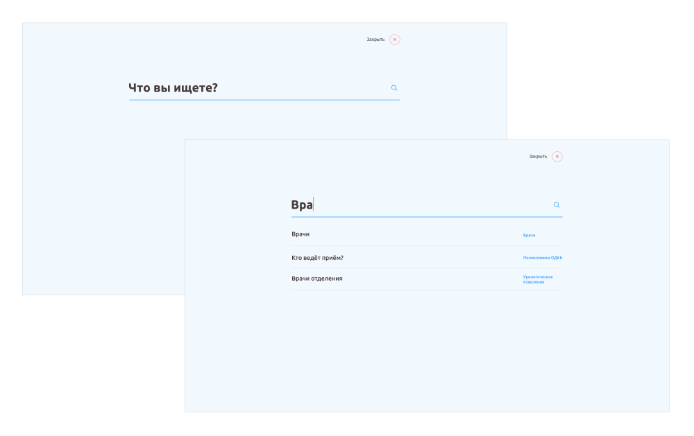 Еще одна функция, которая важна для сайта с большим количеством информации — поиск по всему ресурсу. Он позволяет найти врача, услугу, подразделение по ключевым словам и экономит время посетителей сайта. Не нужно ходить по всем страницам в поисках информации, если пользователь точно знает, что он хочет найти.