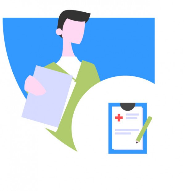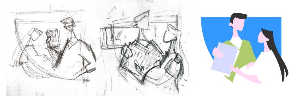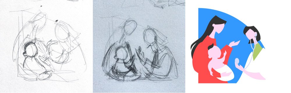 В качестве главного визуального образа использовали иллюстрации в минималистичном стиле. В них символически передаем ситуации общения пациентов с врачами.