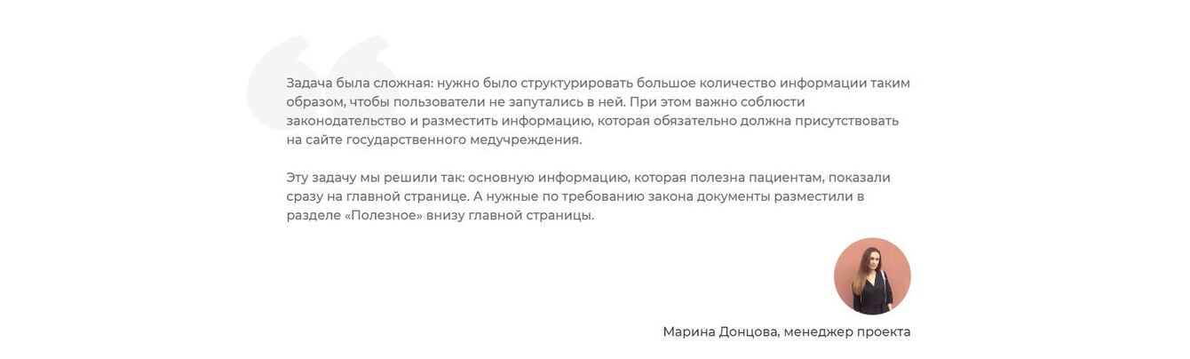 Для этого мы проинтервьюировали главврача и ключевых сотрудников больницы, выяснили приоритеты в развитии медучреждения и обязательные требования к сайтам этой тематики.