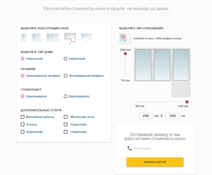 Онлайн-расчет стоимости пластиковых окон - это всегда полезный инструмент для пользователя и возможность получить заявку от клиента на сайт. Нашей командой разработчиков был создан функциональный калькулятор стоимости окна в Калуге без лишних деталей.