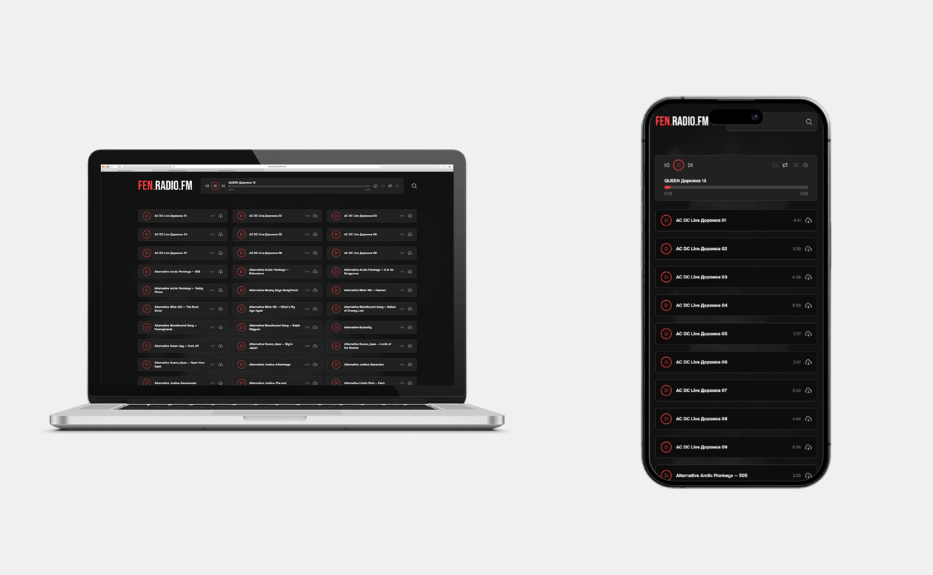 Наш клиент — онлайн-радиостанция Fen Radio, которой требовался минималистичный и функциональный сайт-плеер, позволяющий пользователям быстро включать эфир и комфортно слушать радио с любых устройств. Основной задачей стало создание современного интерфейса, который не перегружает пользователя лишней информацией, фокусируется на главной функции — воспроизведении потока — и при этом формирует узнаваемый визуальный образ станции.