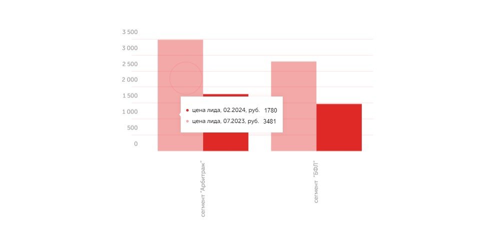 В сегментах БФЛ и Арбитраж лиды по определению стоят дороже, но и качество их лучше — их легче закрывать на сделку. Мы снизили цену лида на 51 % в сегменте “Арбитраж”, а также снизили цену лида на 53 % в сегменте "БФЛ".