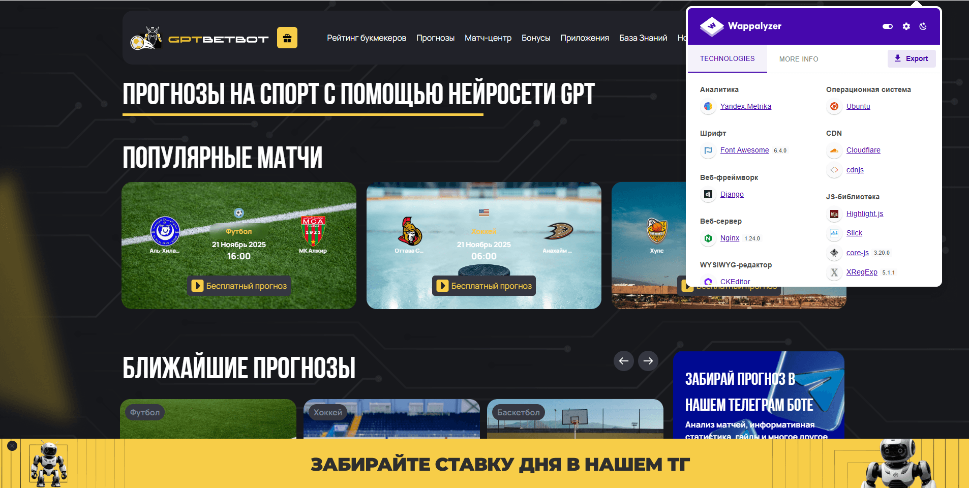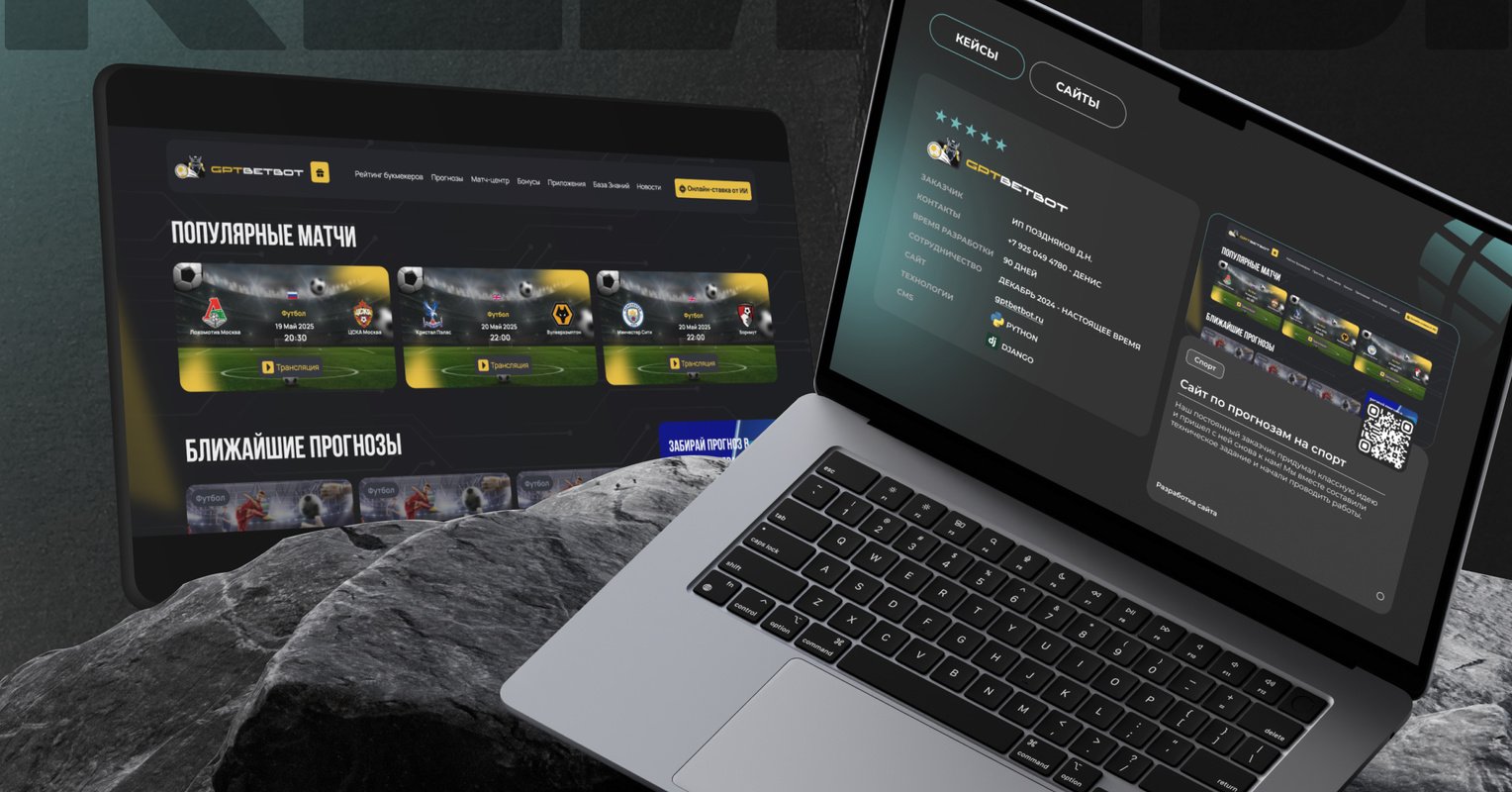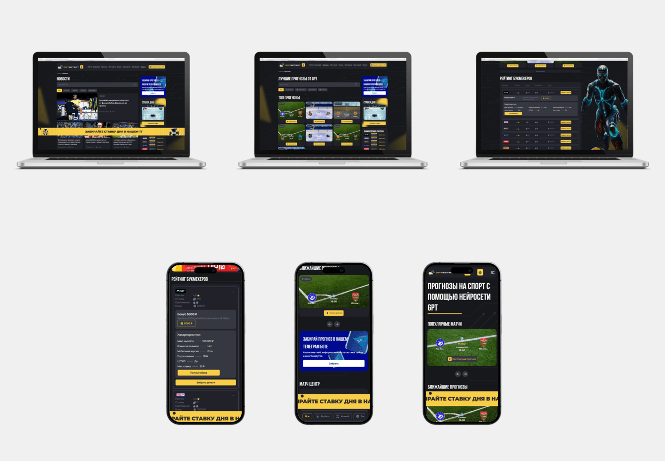Наш клиент — сервис GPTBetBot, который предоставляет спортивные прогнозы, созданные с использованием нейросети GPT. Клиенту нужен был современный, быстрый и удобный многостраничный сайт, который вызывал бы доверие, объяснял механику работы сервиса и мотивировал пользователей подписываться на прогнозы. Важно было создать визуально «технологичный» продукт, но при этом сохранить понятность и простоту для широкой аудитории.