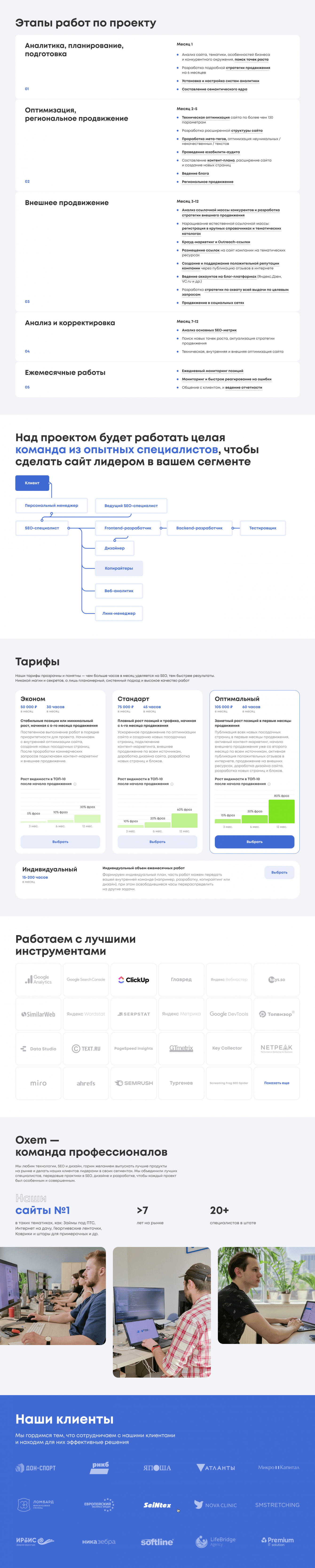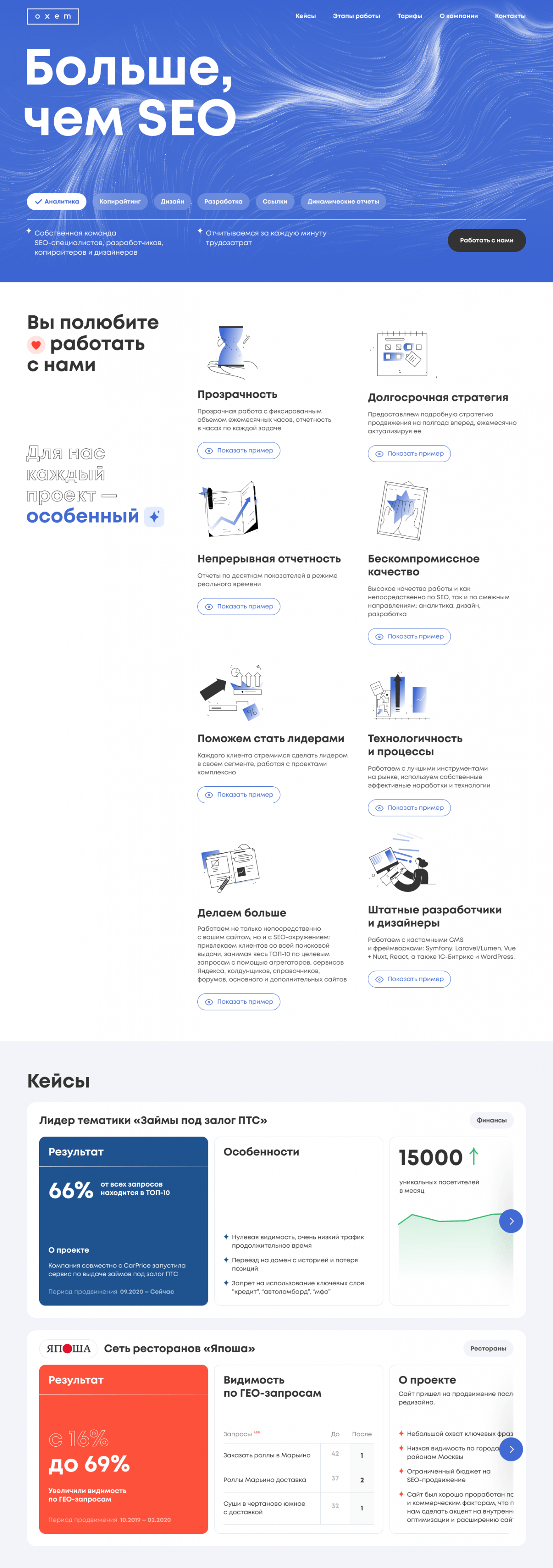 Нам нужно было сделать лендинг для SEO-юнита Oxem, который будет самым подробным лендингом на рынке SEO-направления.