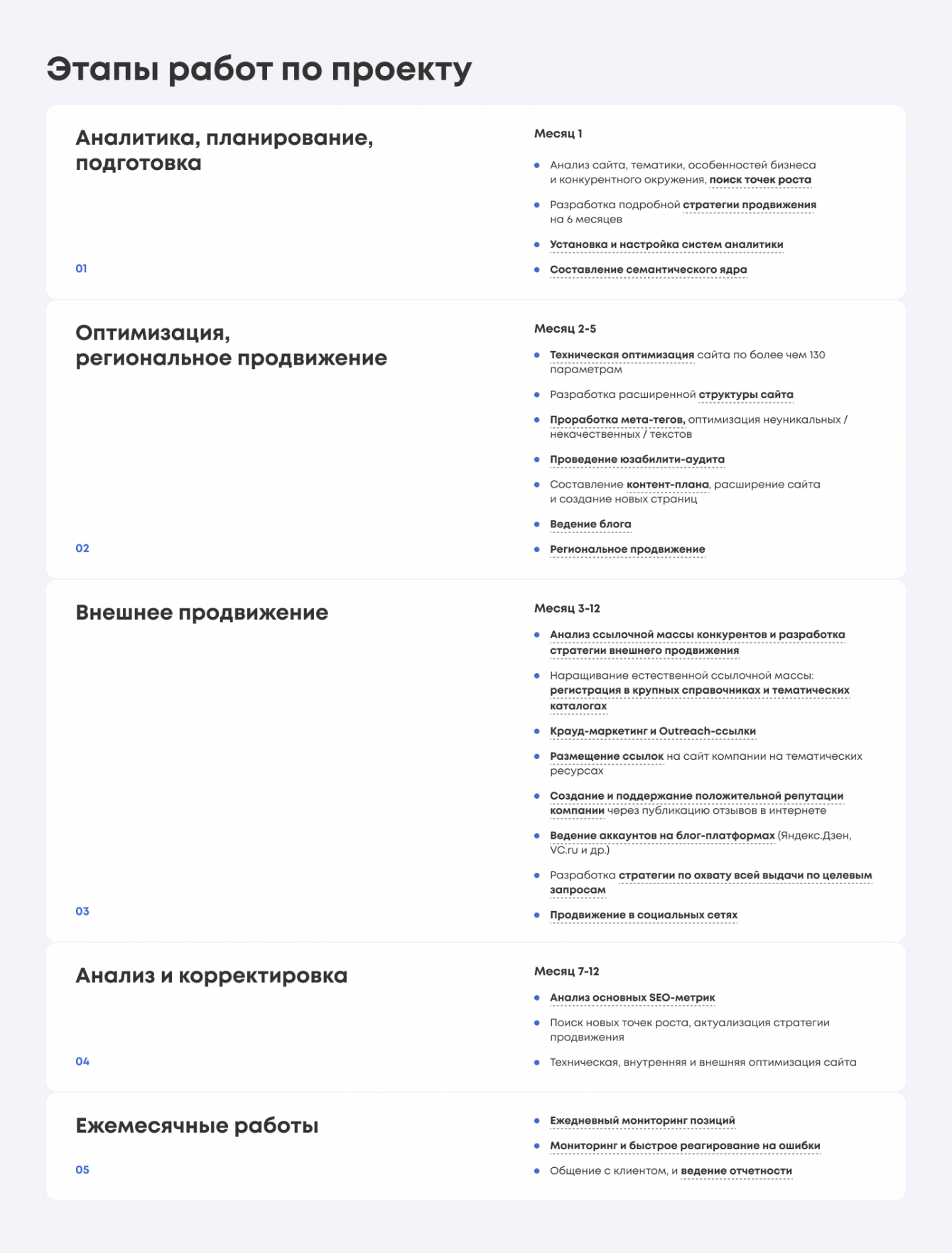 Например, в блоке «Этапы работу по проекту» не просто указали этапы работы, а еще добавили в каждый подэтап все артефакты, которые мы будем собирать на данной стадии работы.